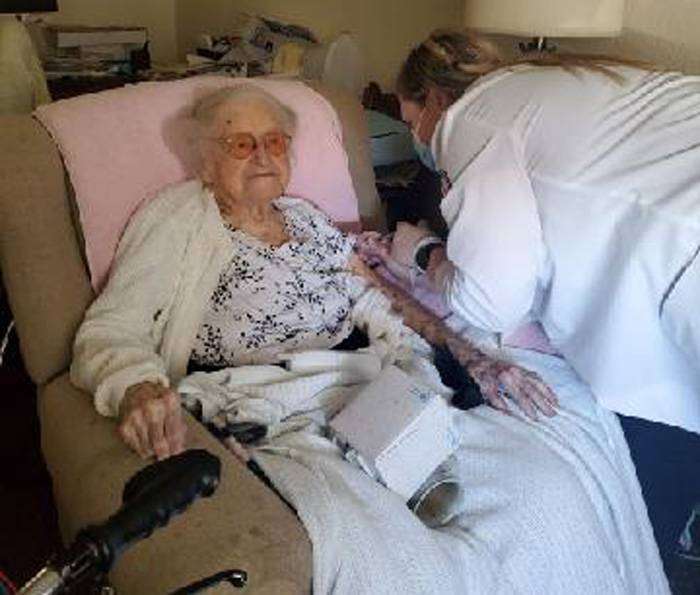 INNOCULATION EXPERT AND PATIENT … 105-year old Mrs. Ramona Heinzerling receives the first of two COVID-19 vaccinations from her great-granddaughter, Alyssa Maier. (Photo courtesy of Alyssa Maier)