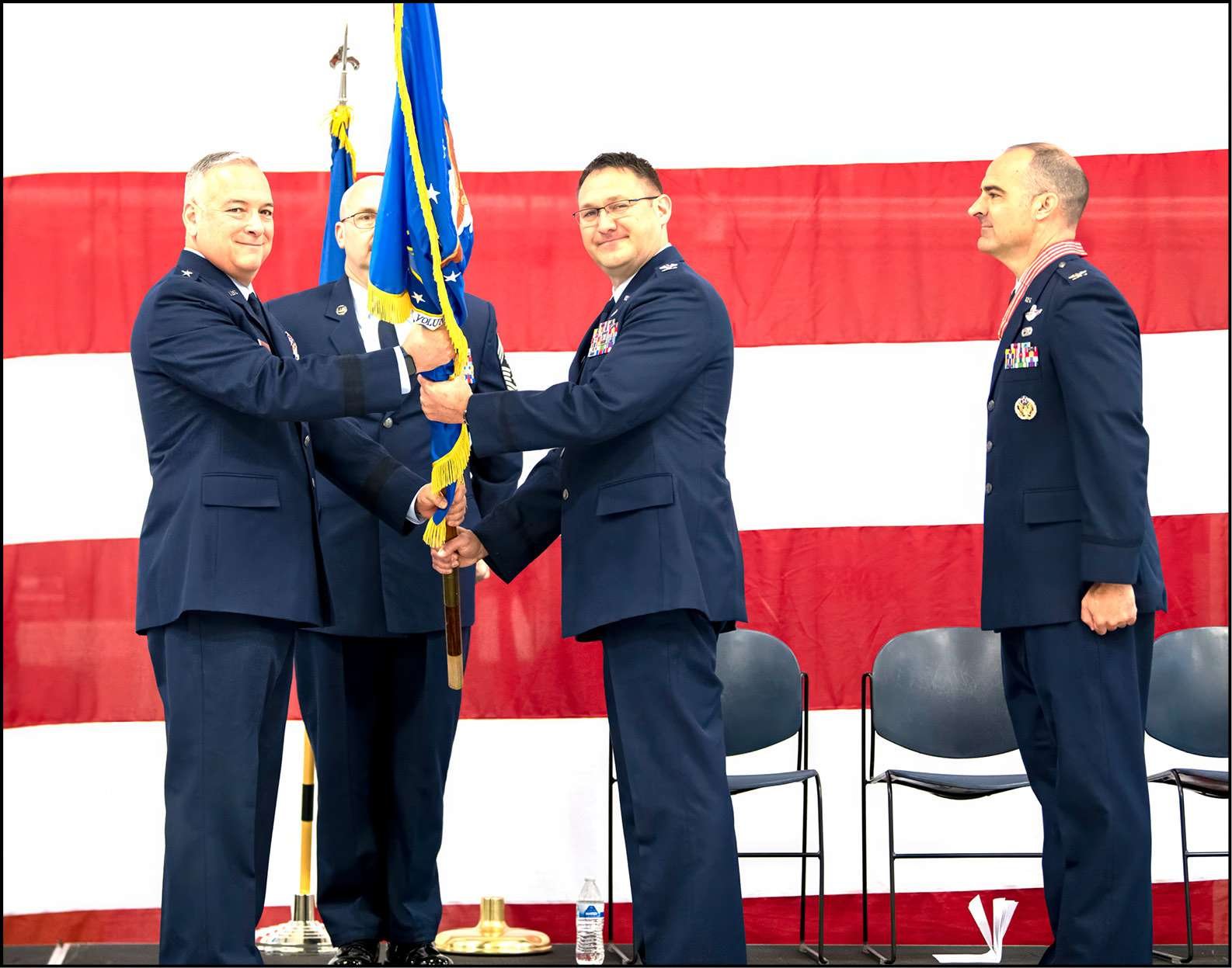 CHANGE OF COMMAND … U.S. Air Force Col. Curtis Voltz, commander of the Ohio National Guard’s 180th Fighter Wing, receives the 180FW flag from U.S. Air Force Brig. Gen. Francisco Dominguez, Deputy Assistant Adjutant General for Air, Ohio National Guard, signifying his assumption of command of the unit, during a change of command ceremony in Swanton, Ohio, April 5, 2025. During the ceremony, outgoing 180FW commander, Col. Chad Holesko, relinquished command to Col. Voltz.