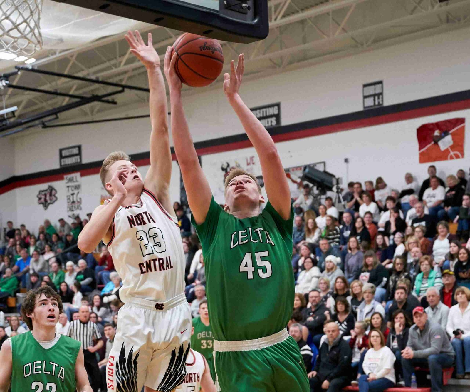 BLOCKED SHOT … North Central’s Zack Hayes goes up to block a shot in a game last season versus Delta. Hayes is expected to be an important contributor this year for the Eagles. (PHOTO BY RICH HARDING, STAFF)