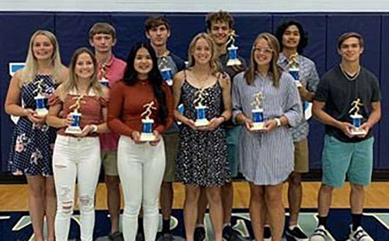 TRACK AWARDS … (Front) Tristen Bexten (Best Attitude), Emily Maniseng (Most Improved), Jacee Altaffer (Promisng 1st Year Athlete), Chelsea McCord (MVP Runner). (Back) Chloe Bard (MVP Field Event), Landon Brigle (Most Improved), Thomas Jay (MVP Runner), Kaden Cummins (MVP Field Event), Andre Aguirre (Best Attitude), Brenned Friend (Promising 1st Year Athlete).