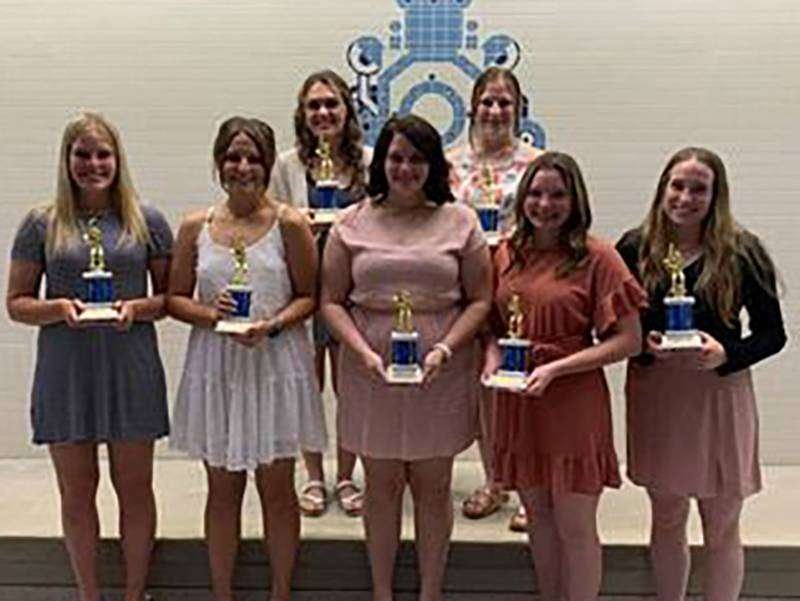 SOFTBALL AWARDS … (Front) Jessica Bumb (Varsity MVP), Emily Fritsch (Varsity Coaches Award), Ashley Caudill, (Varsity Offensive Award), Alyssa Custer (Varsity Most Improved), Cadey Hillard (Varsity Defensive Award). (Back) Kaycee Humbarger (JV MVP), Reese Hand (JV Most Improved).