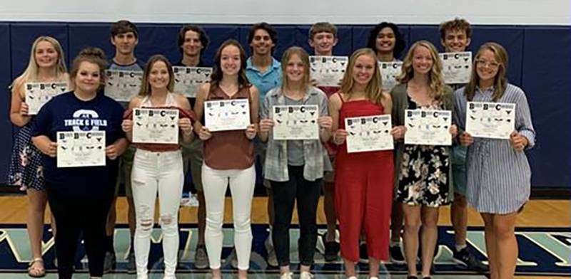 TRACK BBC SCHOLAR ATHLETES … (Front) Serenity Caldwell, Tristen Bexten, Rachel McIntosh, Riley Rockey, Addison Thompson, Lyndsi Engels, Chelsea McCord. (Back) Chloe Bard, Thomas Jay, Tylor Yahraus, Collin Crisenbery, Landon Brigle, Andre Aguirre, Kaden Cummins. Missing-April Schaffter