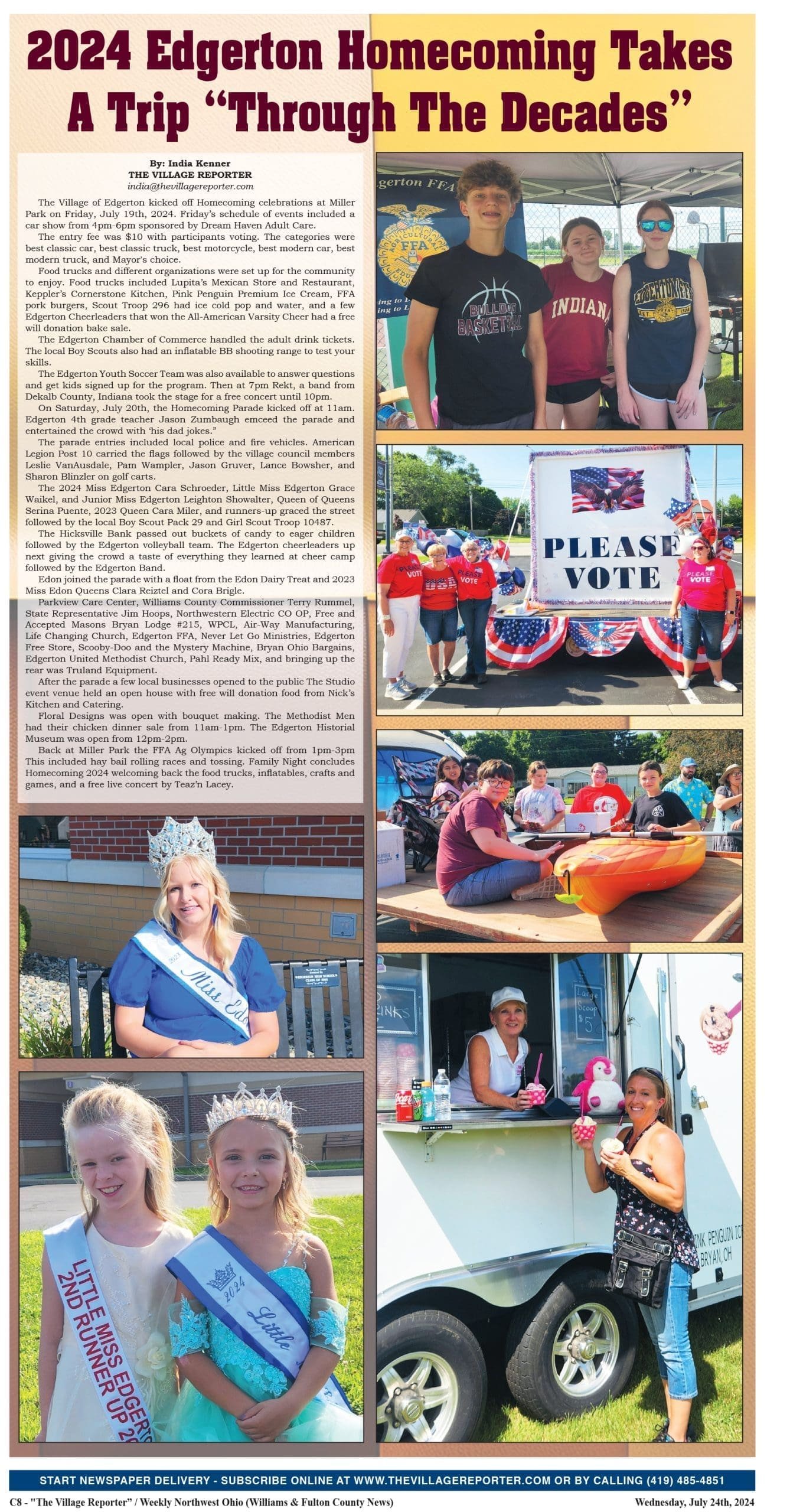 The 2024 Miss Edgerton Cara Schroeder, Little Miss Edgerton Grace Waikel, and Junior Miss Edgerton Leighton Showalter, Queen of Queens Serina Puente, 2023 Queen Cara Miler, and runners-up graced the street followed by the local Boy Scout Pack 29 and Girl Scout Troop 10487.