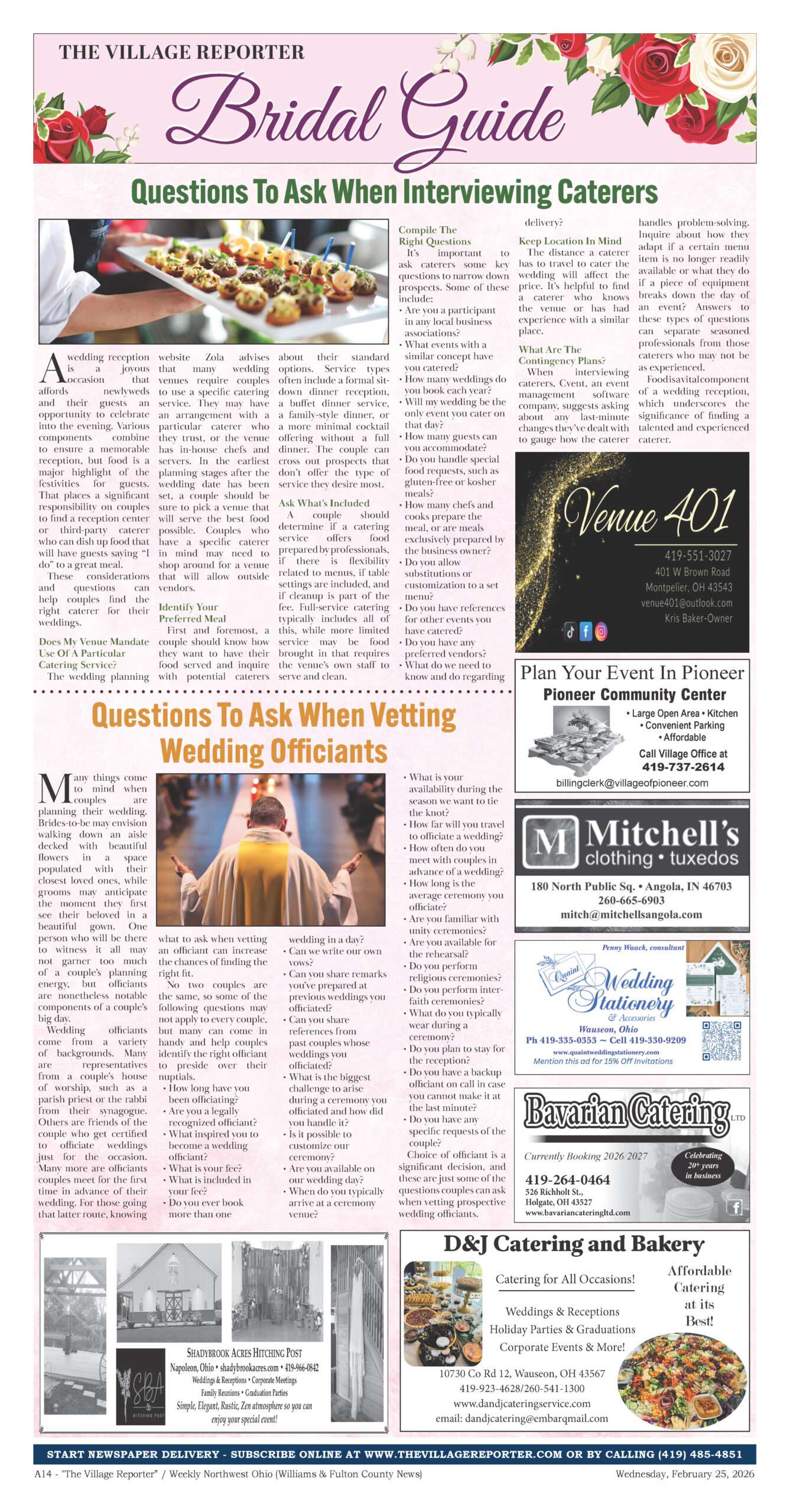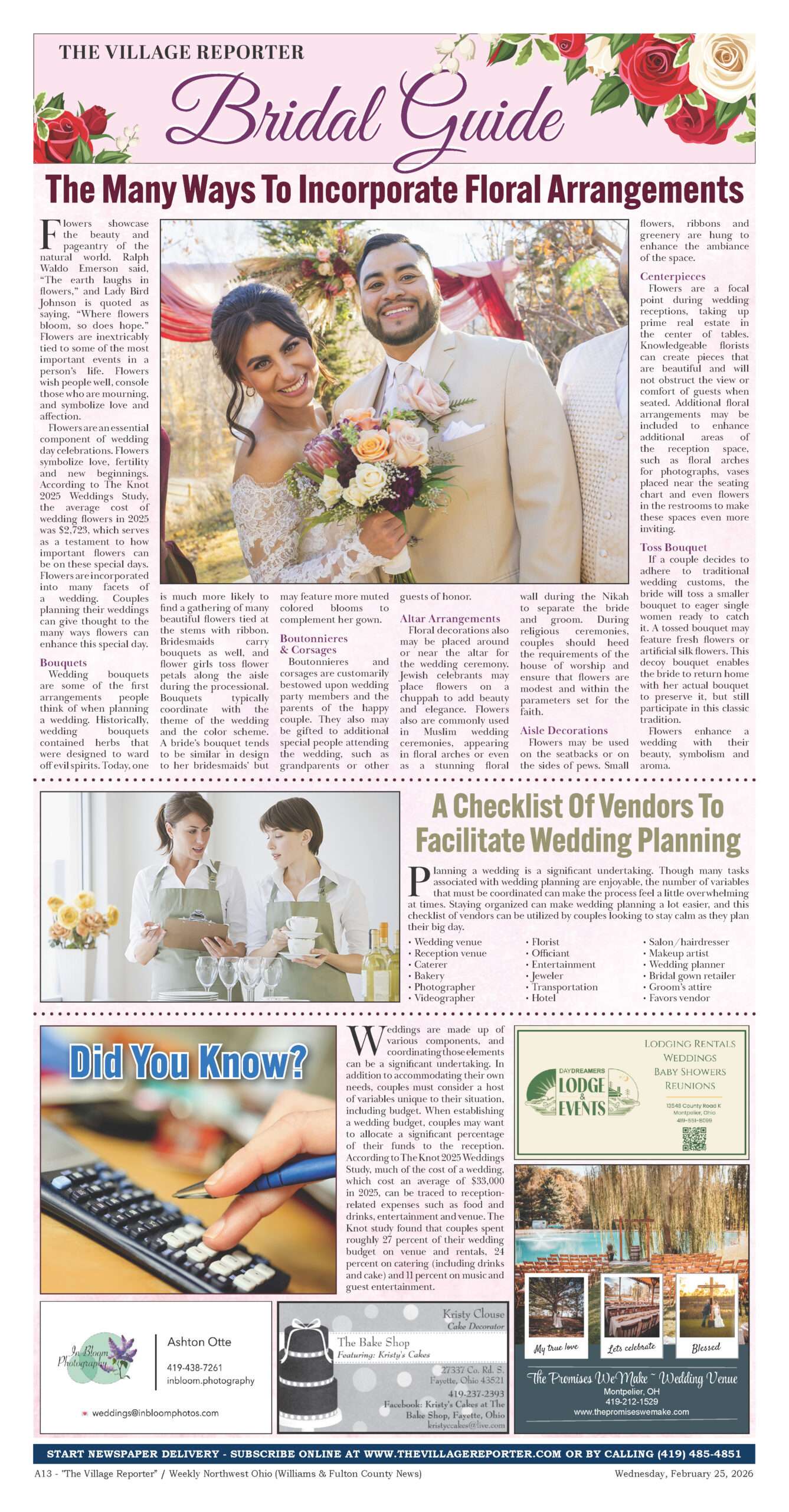 Planning the perfect wedding? Check out The Village Reporter’s 2026 Bridal Guide for expert tips on floral arrangements, catering, officiants, venues, and more. Get your copy in this week’s edition or view it free online!