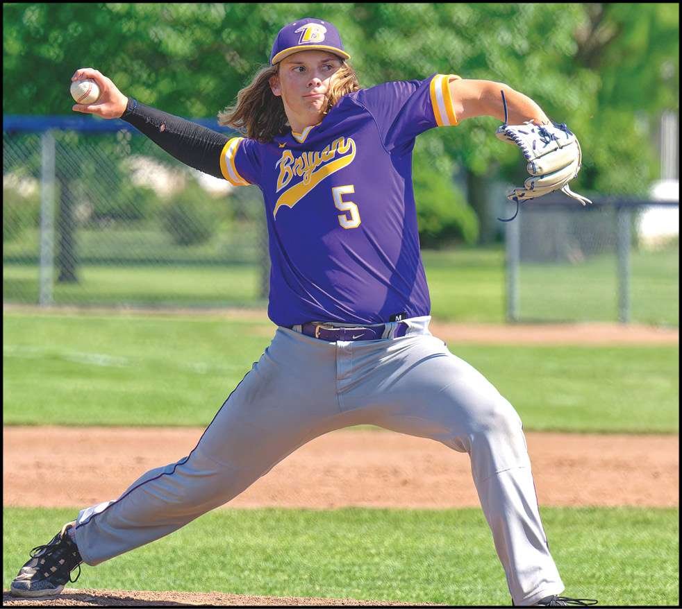 2024 NWOAL PLAYER OF THE YEAR … Bryan’s Carter Dominique delivers a pitch in last year’s district semifinal versus Napoleon. Dominique leads a solid core of returners for Bryan as they look to compete for a league title.