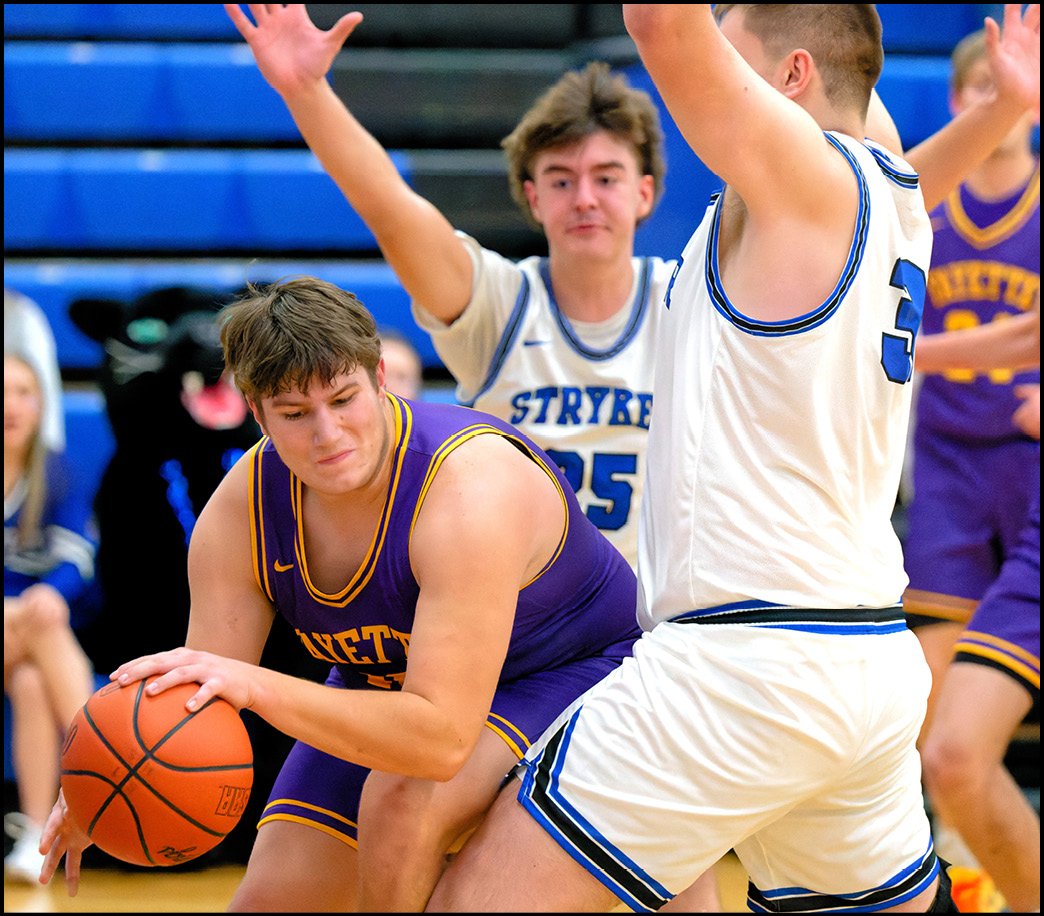 SURVEYING THE FLOOR … Stryker’s Bradley Williams handles the ball during last Tuesday’s win over Fayette.