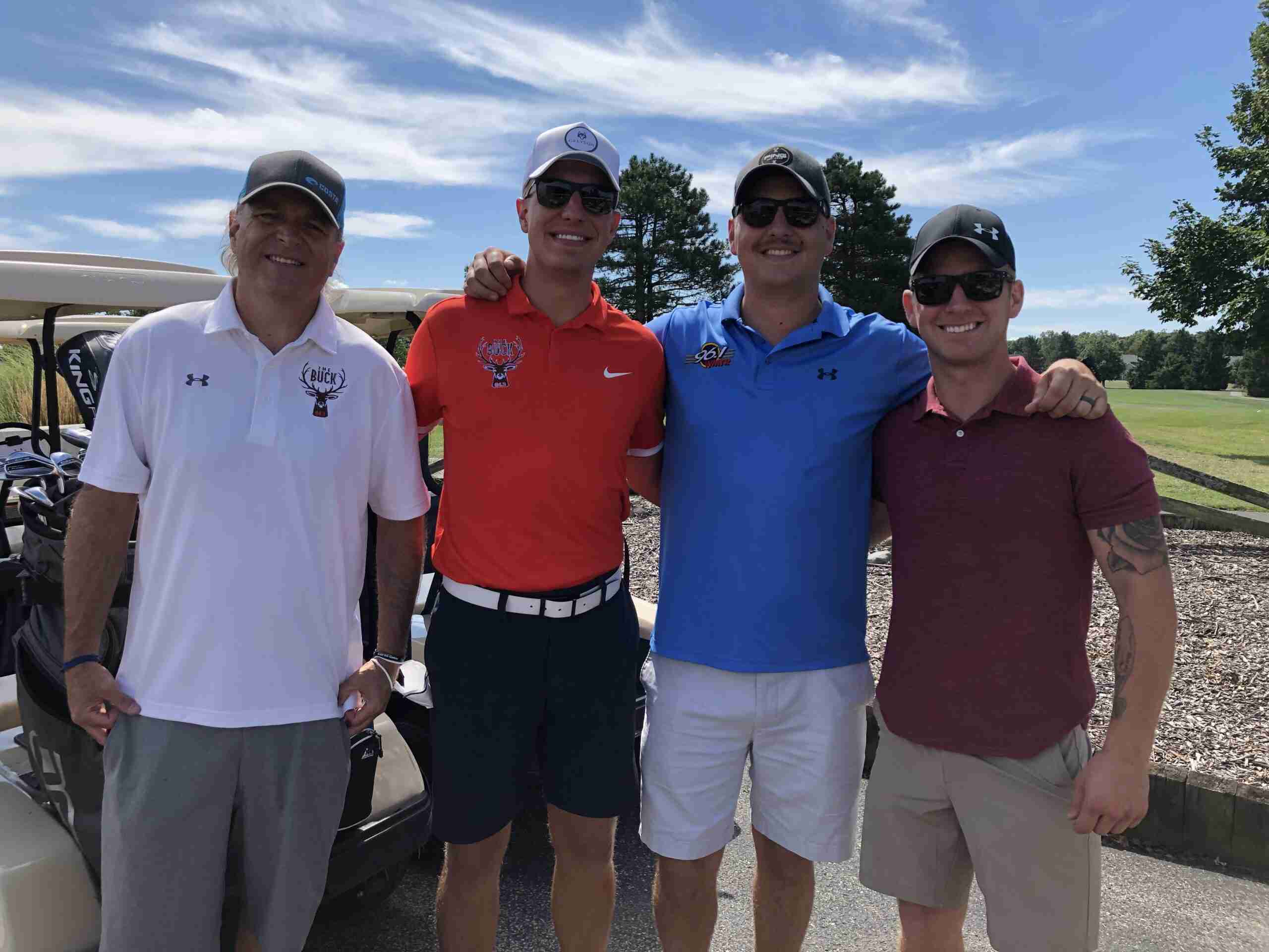 FATHER, SONS AND FRIEND … Team 94.3 The Buck, 96.1 WMTR posed for a picture beside their carts with their golf equipment ready to go. Left to right are Max Smith with his sons Trey and Drew, with friend Dalton Panning finishing off the team.