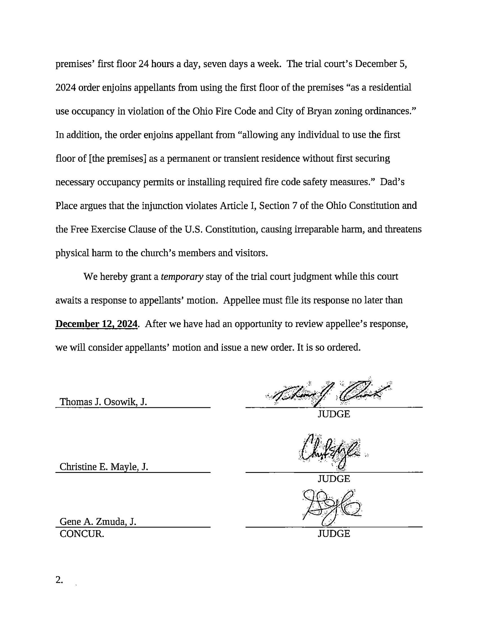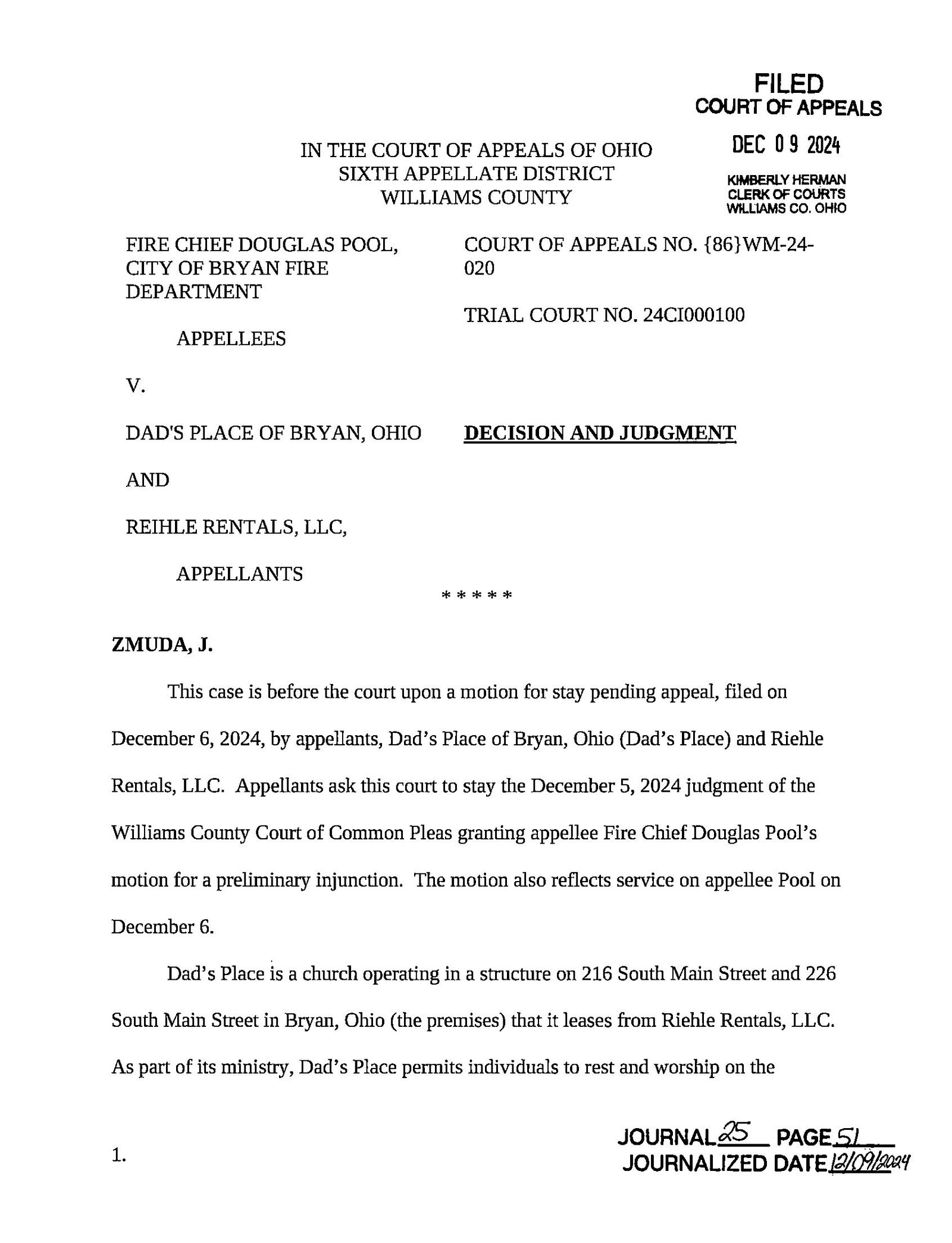PRESS RELEASE & STAFF – In a significant legal development today, the Court of Appeals of Ohio Sixth Appellate District issued a temporary stay in a lawsuit against Dad’s Place, a church located in Bryan, Ohio. This decision temporarily halts the enforcement of a previous judgment, allowing for further examination by the Appeals Court. The court has given the city until Thursday, December 12, to respond to the stay order. The court’s official order is attached to the proceedings.