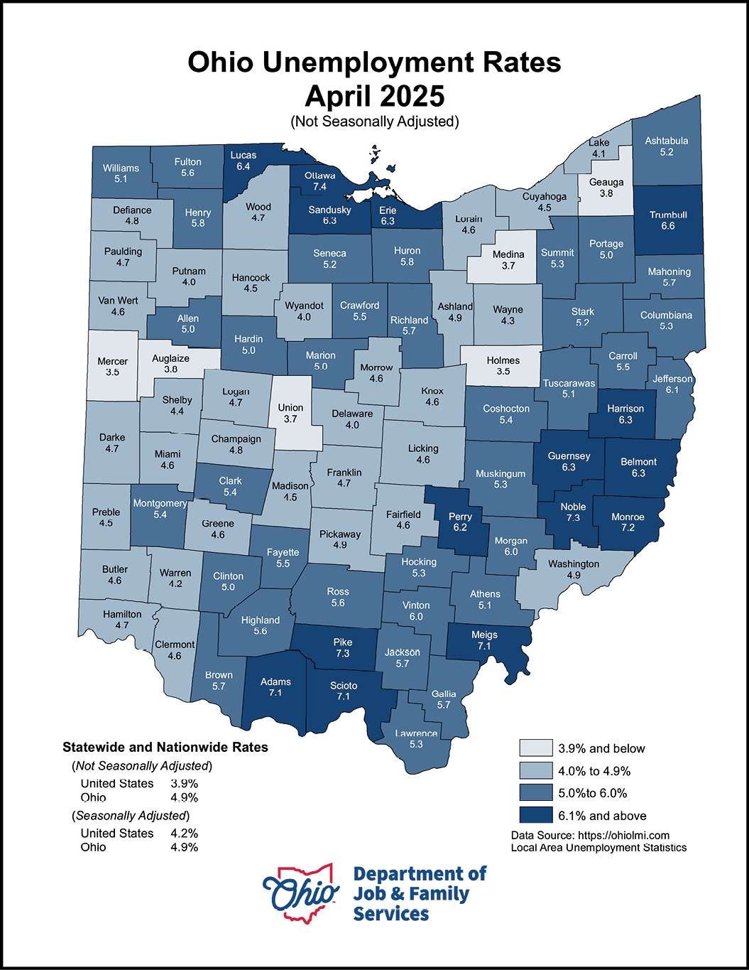 Across Ohio, the statewide unemployment rate stood at 4.9%, reflecting further improvement from the 5.1% rate reported in March. On a national level, the U.S. unemployment rate improved notably, decreasing to 3.9% compared to 4.2% in March.