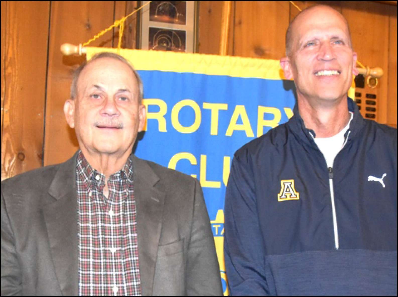 UPCOMING SEASON … Joe Frank (right), Archbold boys varsity basketball head coach, recently told Archbold Rotarians that the Bluestreak team will be a work in progress for the start of the season due to the playoff run that the football team had, noting that many of the basketball players also played football. The presentation was arranged by Rotarian Bill Rufenacht (left).