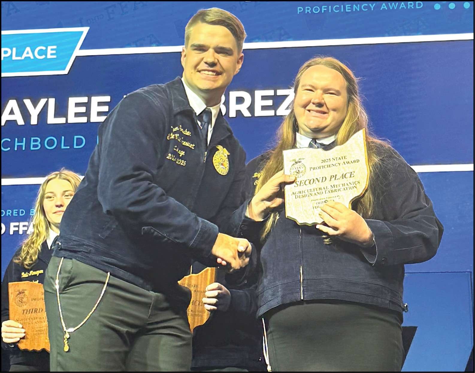 PROFICIENCY AWARD … Baylee Lumbrezer receives her award for placing second in the Agricultural Mechanics Design and Fabrication Proficiency Award at the 2025 Ohio FFA State Convention.