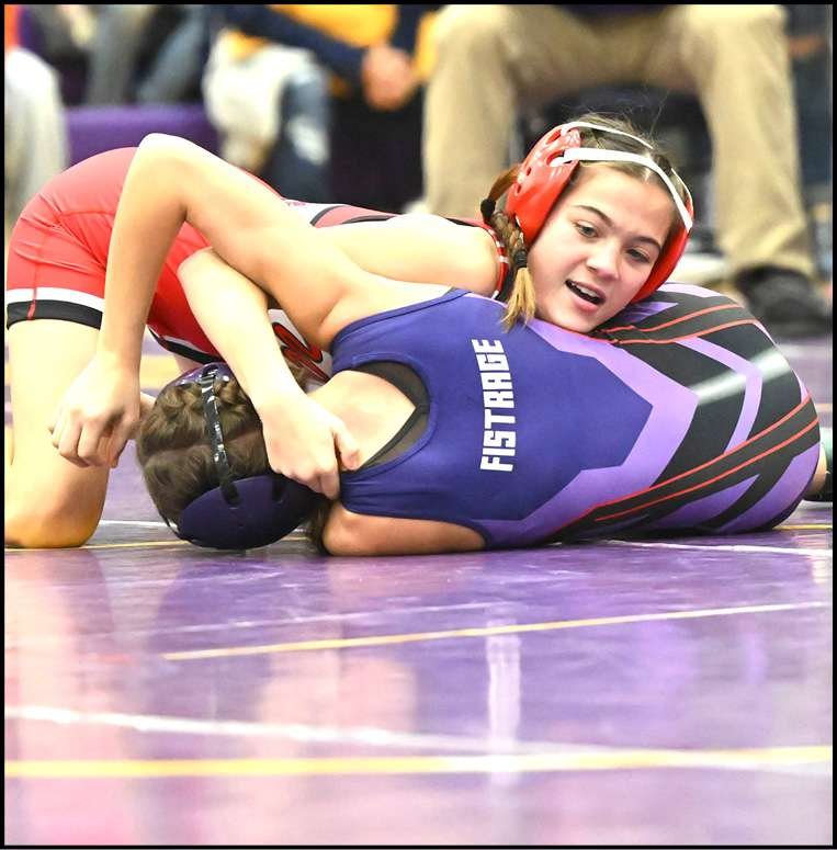 100 POUNDS … Aryana Jacobs (red) of Wauseon, placed second in the100-pound division at the Bryan Golden Bears Girls Wrestling Invitational.