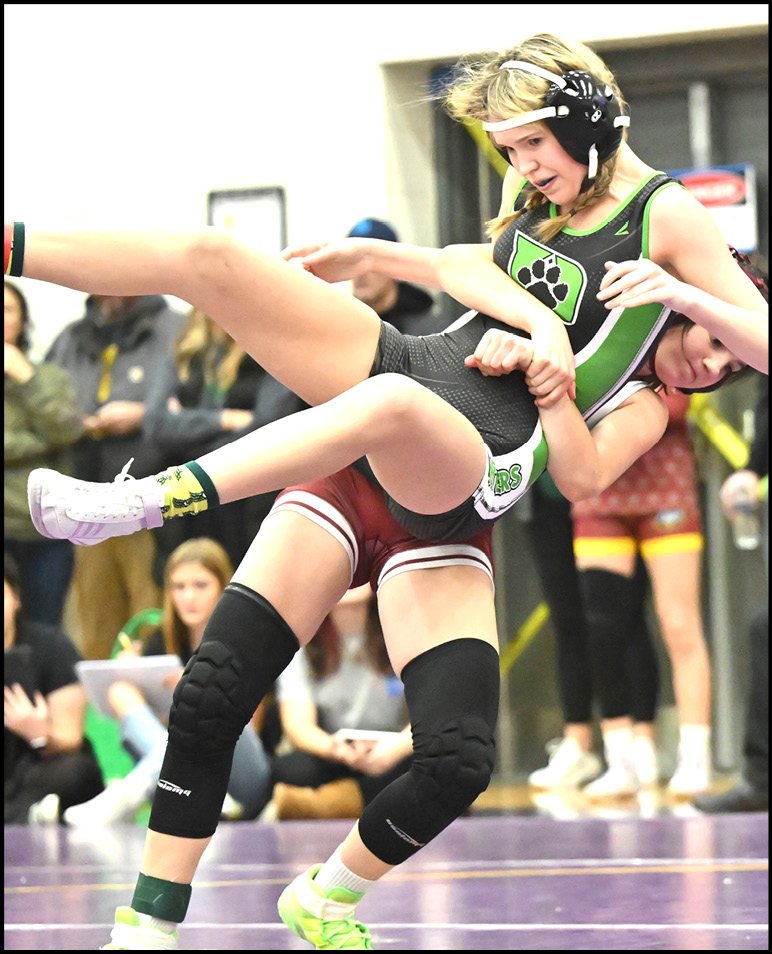 115 POUNDS … Chloe Hazelton (Edgerton) picks up Paige Hosler (Delta) during a first round match at Bryan High School. Hosler would get the win by decision to advance to the second round.
