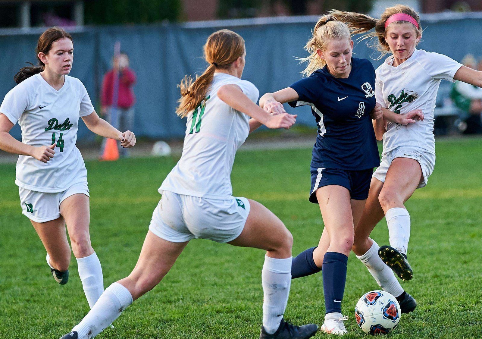 TOURNAMENT ACTION … Leah McQuade (#4) of Archbold fights her way through Delta defenders. VIEW 731 PHOTOS OF THIS CONTEST ONLINE FOR FREE AT WWW.THEVILLAGEREPORTER.COM. (PHOTOS BY RICH HARDING, STAFF)