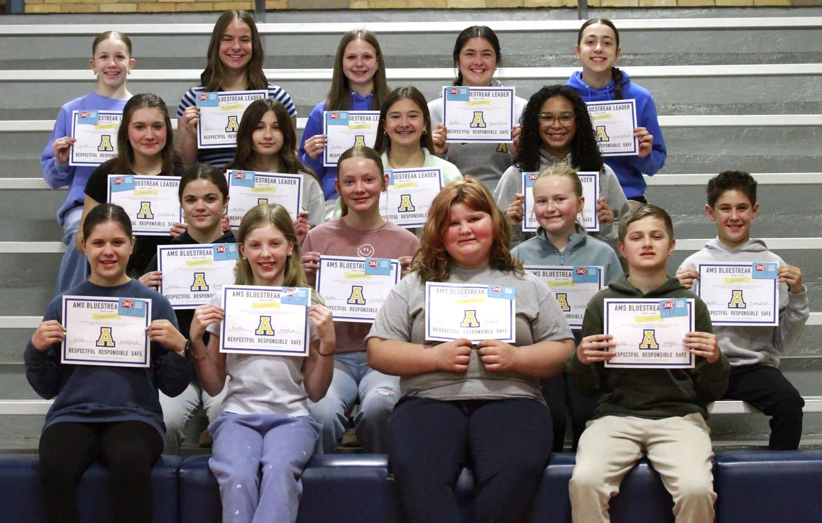 MARCH LEADERS … AMS proudly announces our Bluestreak Leaders for March, chosen for exemplifying exceptional character the Bluestreak Way. Fifth grade: Lucy Politz, Oakley DeGroff, Paige Jones and Ty Wyse. Sixth grade: Jett Figgins, Kennedy Ruffer, Norah Fruth and Olivia Stuckey. Seventh grade: Emagene Gracia, Hollyce Baun, Katelyn Fry and Laila Lewis. Eighth grade: Ayla Figgins, Brynlee Bowerman, Emi Pinter, Lorelei Miller and Taylor Rufenacht.