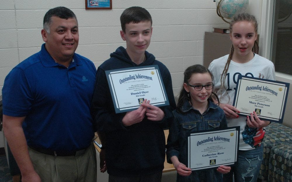 The board honored district representatives to the countywide Spelling Bee. Receiving a certificate of appreciation as well as a goodie bag was: Daniel Oyer, Macy Petersen, Catherine Row and Kaiden Keiser.