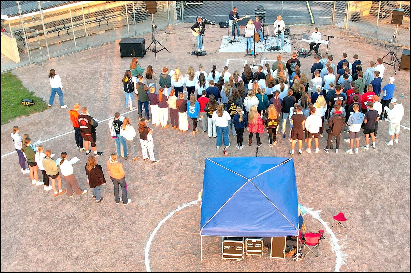 GATHERING … Over 100 students from local schools met for an evening of worship at the Archbold Varsity Softball Field.