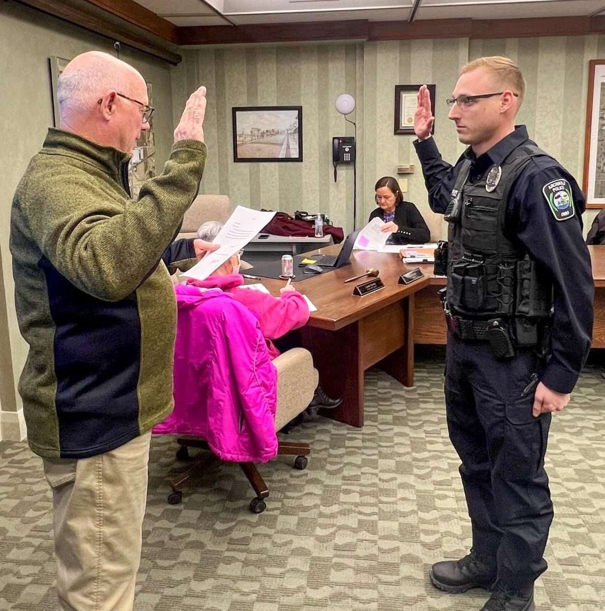 SWEARING-IN… Archbold Mayor Brad Grime swears in Patrol Officer Nathanael Beck during the village’s council meeting.