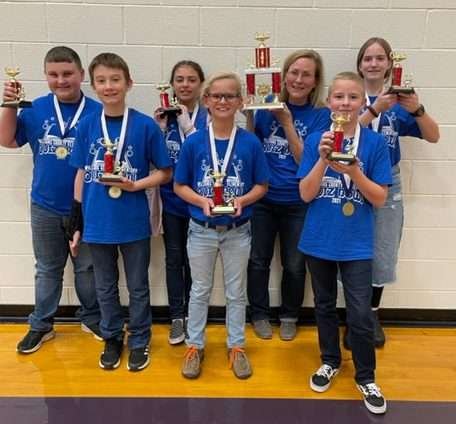 FIRST PLACE TEAM … Front (left to right): John Deitemeyer, Sidney Luce, Finley Davis. Back (left to right): Coach Jane Shaffer, Mycah Smith, Bryce Welling, Connor Thiel, Coach Michelle Leith. (PHOTOS PROVIDED)