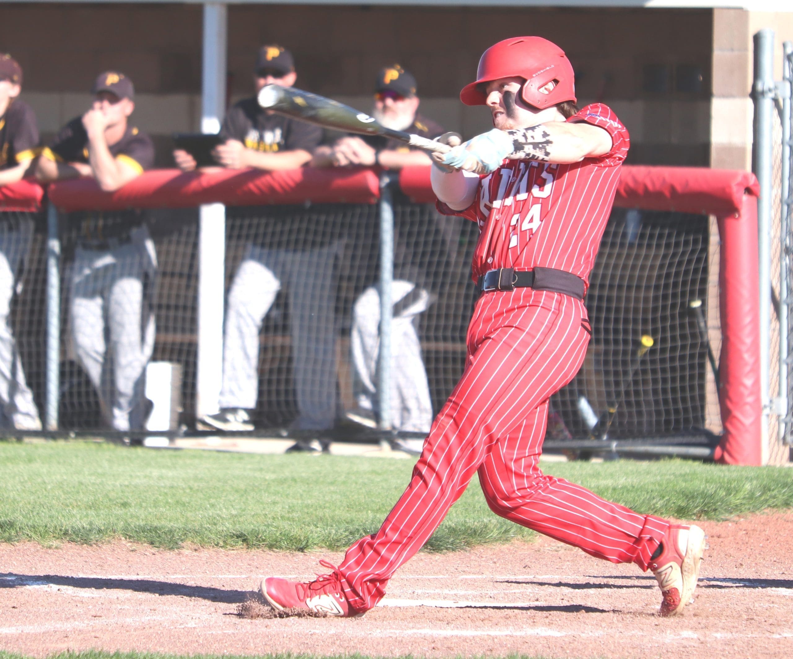 (PHOTOS BY JENNA FRISBY) FIRST INNING ONSLAUGHT … Devin Dempsey clubs a pitch during Hilltop’s nine run first inning in a 10-0 whitewash of Pettisville. VIEW 64 PHOTOS OF THIS CONTEST FOR FREE AT WWW.THEVILLAGEREPORTER.COM