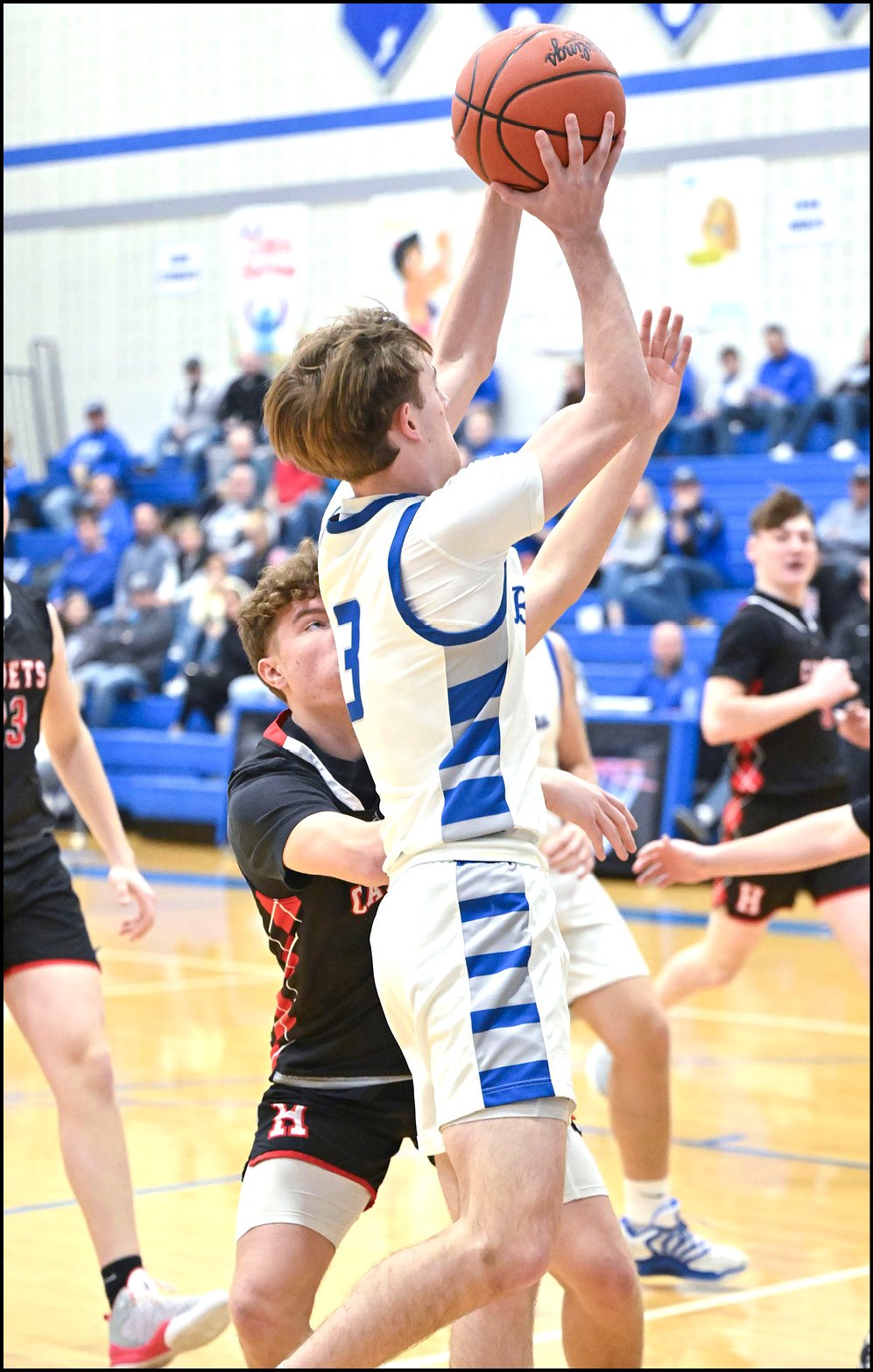 BBC MATCHUP … Austin Verdin snaps off a three-pointer for Hilltop in the opening quarter.