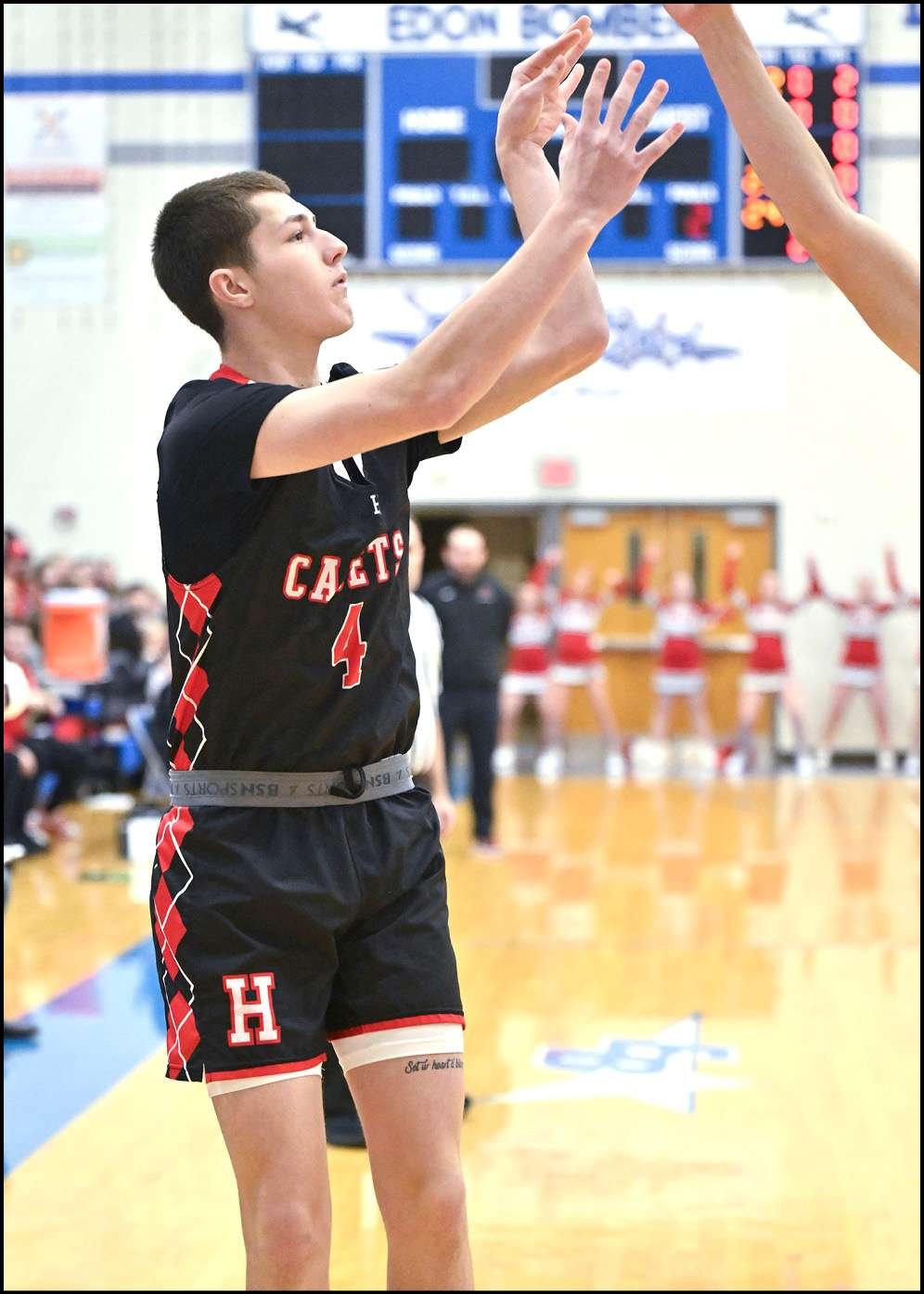 With Hilltop in a zone defense to limit the effectiveness of Edon’s Briggs Gallehue inside, Corbin Chrisman handled the scoring for the Bombers.