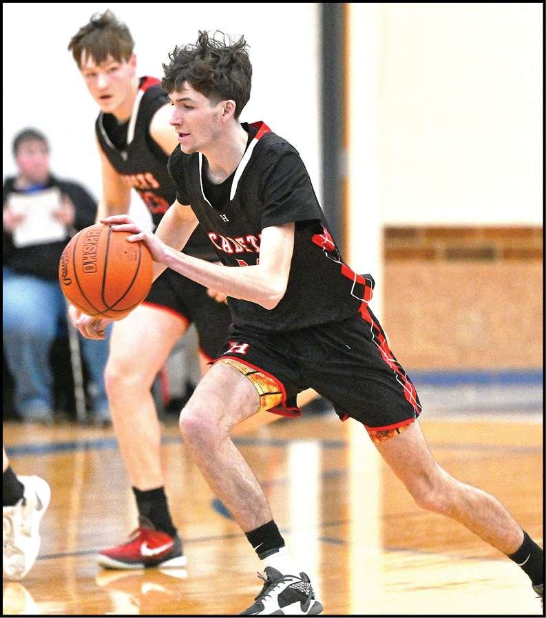 WILLIAMS COUNTY FOES … Hilltop’s Drew Bailey breaks away on the dribble in the Cadets’ BBC contest at Stryker on January 23.