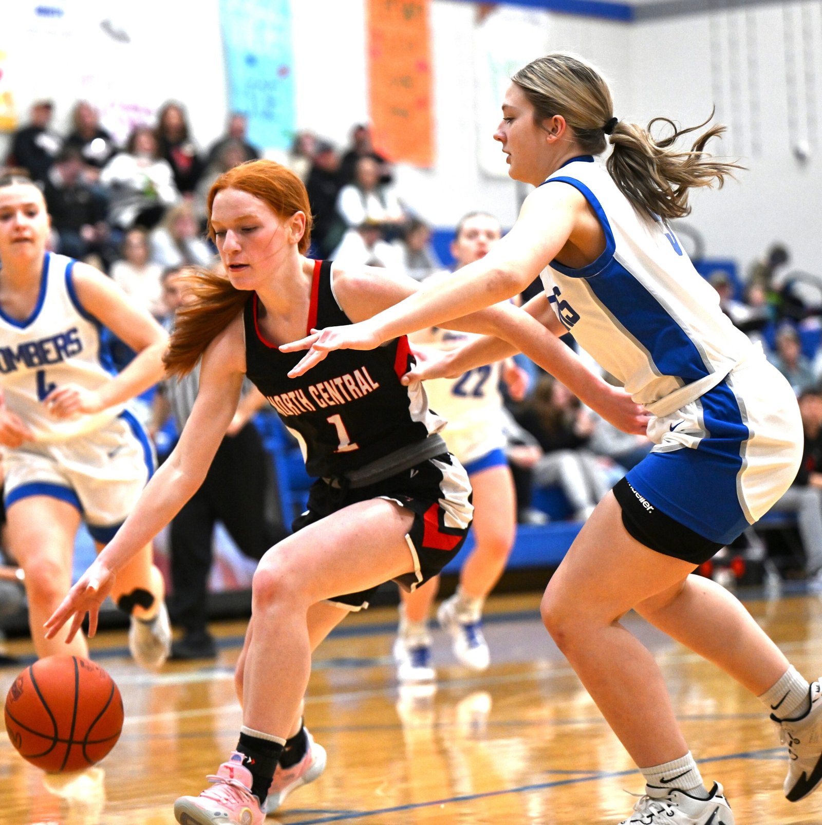 BBC ROAD WIN … North Central’s Cailyn Myers drives the lane in Thursday’s league game at Edon. Myers finished with 16 points on the night as the Eagles pulled out a 45-42 win. VIEW 119 PHOTOS OF THIS CONTEST FOR FREE AT WWW.THEVILLAGEREPORTER.COM