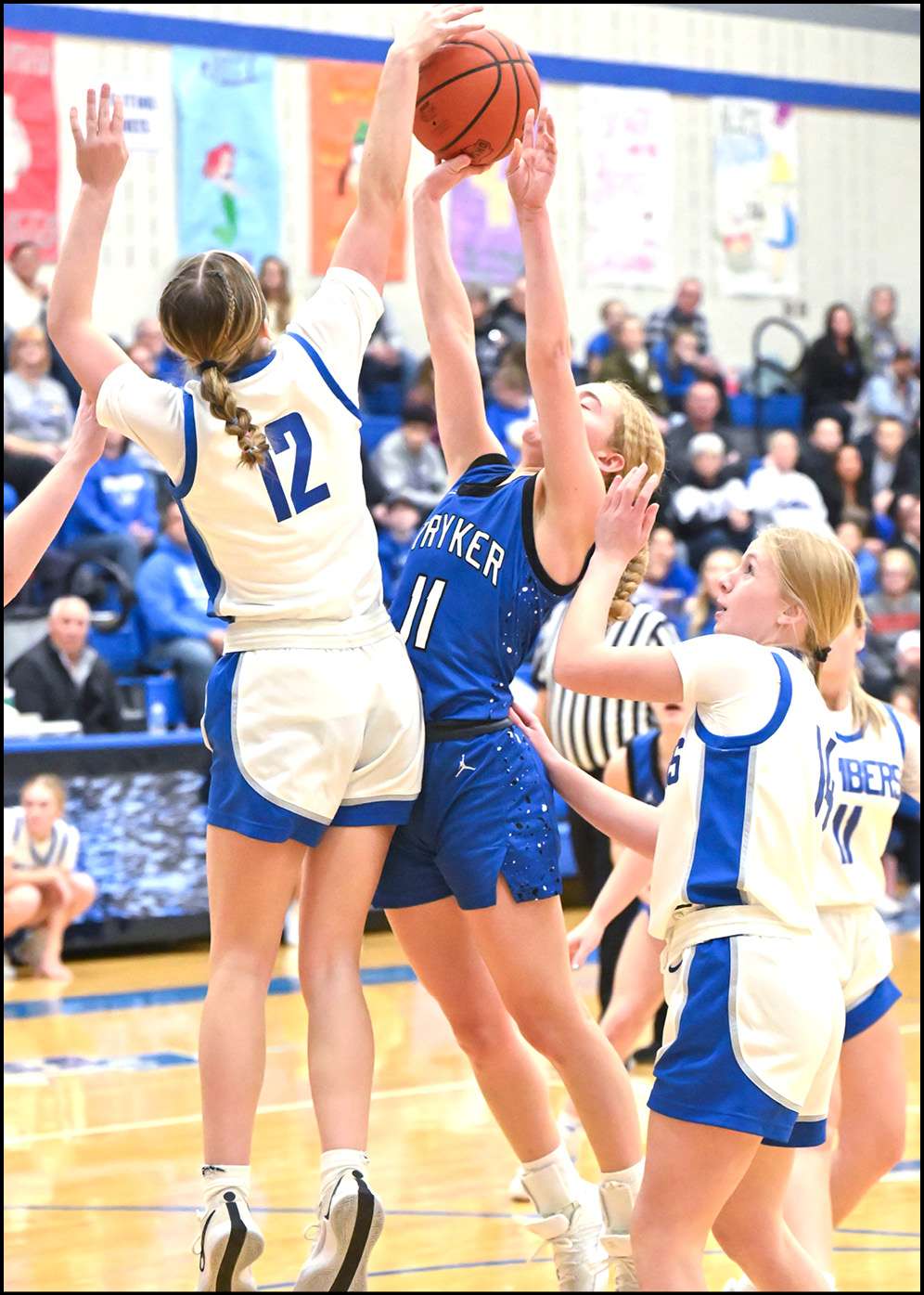 RETURN TO SENDER … Grace Ripke (#12) of Edon denies a shot in the lane by Stryker senior Reiss Creighton.