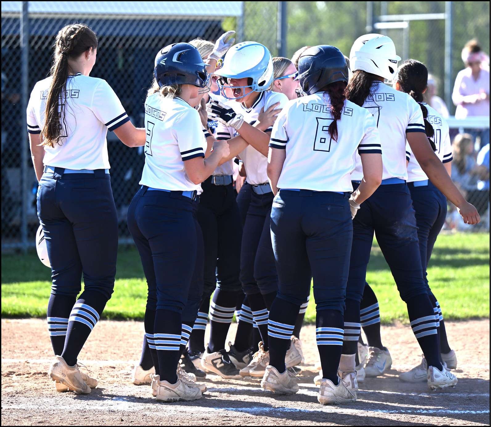 HOME PLATE CELEBRATION … Montpelier teammates mob Lyla Mahan (middle) after her three-run shot in the third inning. Mahan hit for the cycle with five RBIs as the Locos clinched an outright BBC title.