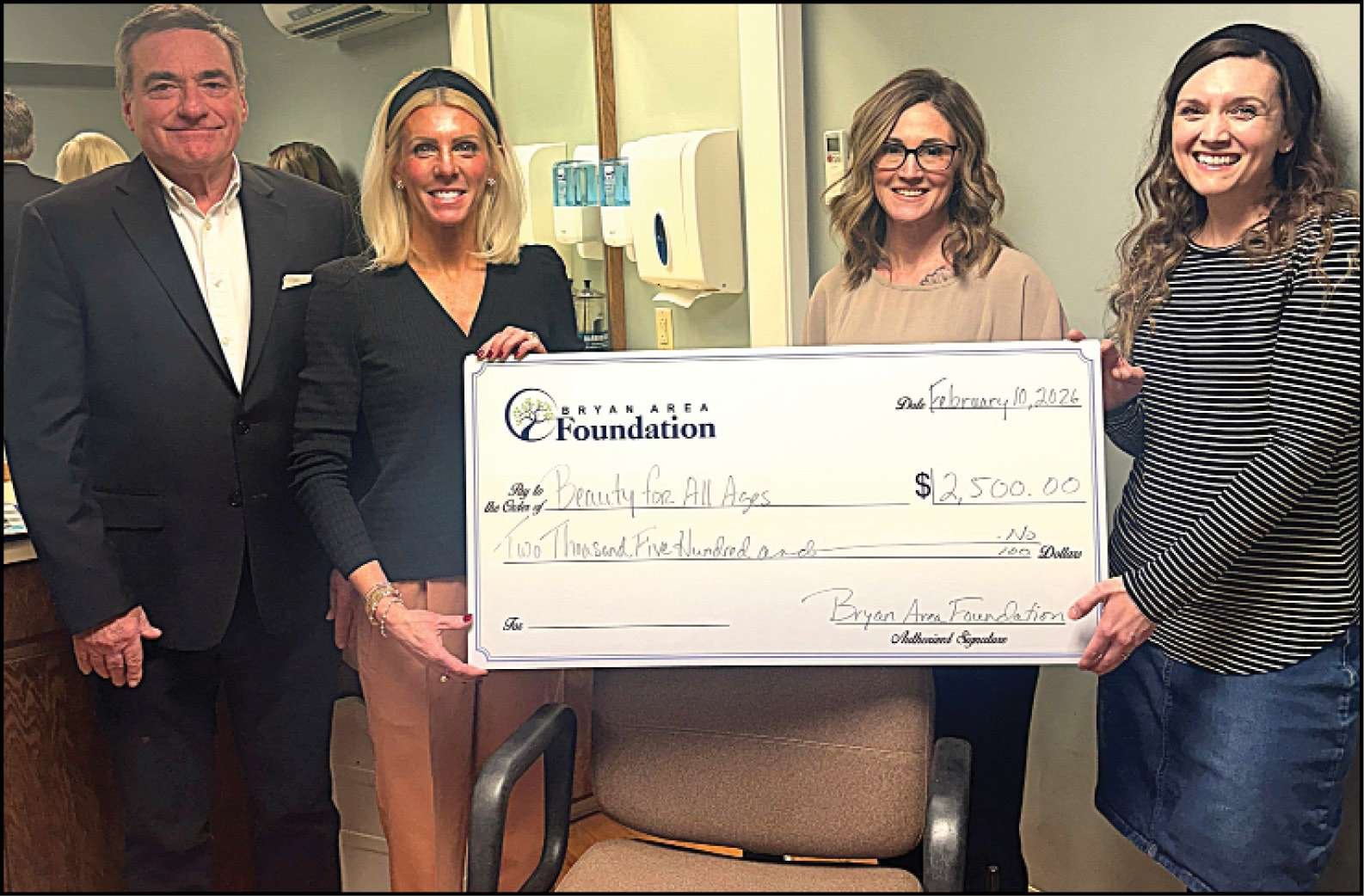 COMMUNITY HAIRCARE INITIATIVE … Congratulations to nonprofit Beauty for All Ages on receiving a $2,500 grant from the Bryan Area Foundation. The funds will provide free, professional hair services to residents with limited resources in partnered assisted living and nursing facilities. Participating in the check presentation, from left to right, are Bryan Area Foundation Grant Making Committee member Cliff Oberlin, Bryan Area Foundation President/CEO Amy Miller, Beauty for All Ages President and Executive Director Amber Gebers, and Beauty for All Ages stylist Morgan Jones.