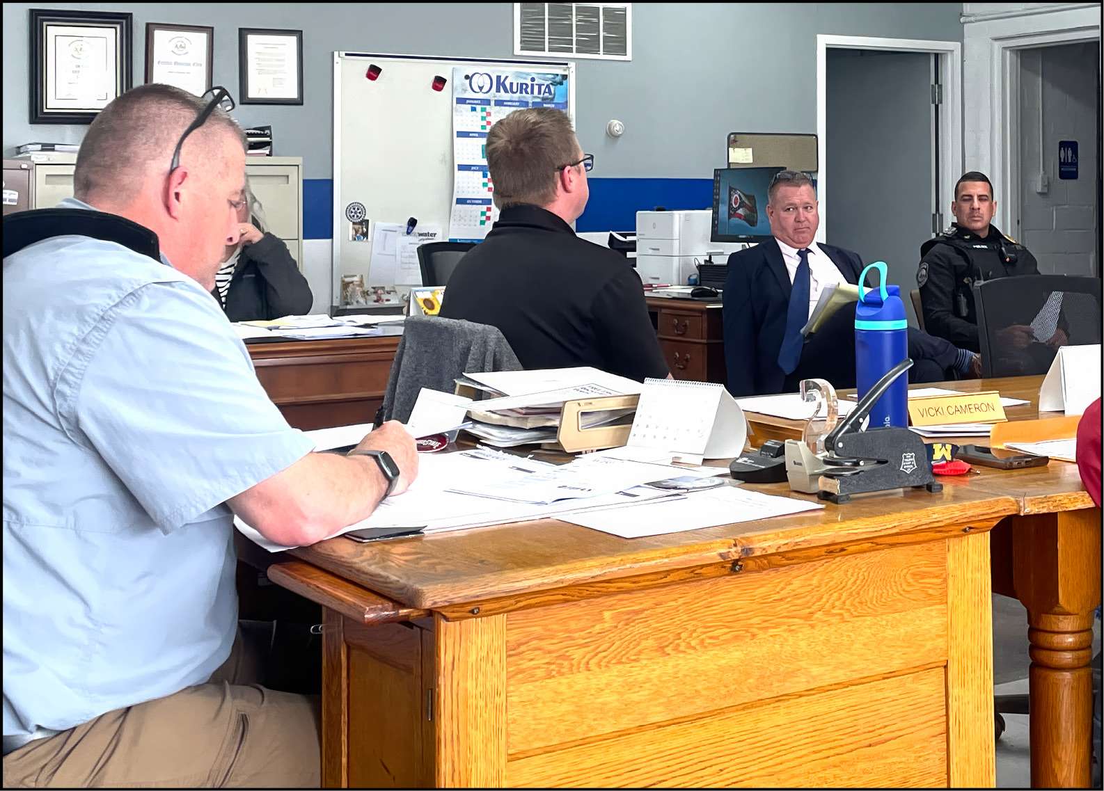 POLICE REPORT … Council members intently listen to PD Chief Mendez (back far right) give reports on the updated training of his officers.