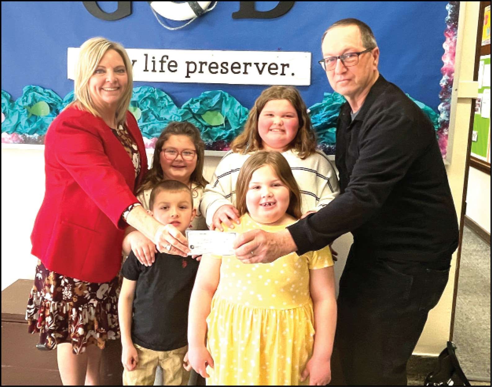 FUNDRAISER … The Blakeslee Knights of Columbus Council #3883 hosted a fundraising brunch at St. Mary Church on Sunday, March 9, in support of St. Mary’s School in Edgerton. Pictured is Grand Knight Jim Wuebben presenting a check to Principal Julie Taylor in the amount of $2,725. Additional funds from a 50/50 raffle and other generous donations brought the total raised to $3,000. A special thank-you goes to Jeff Bowling, Joe Radabaugh, and Mike Gobel of Edon, along with all the Brother Knights (including those from Council #1494) whose hard work and dedication made this event a success. Pictured are Julie Taylor, Daize Laney, Kinze Riblet, Jim Wuebben, Daxten Laney, and Kaeda Riblet.