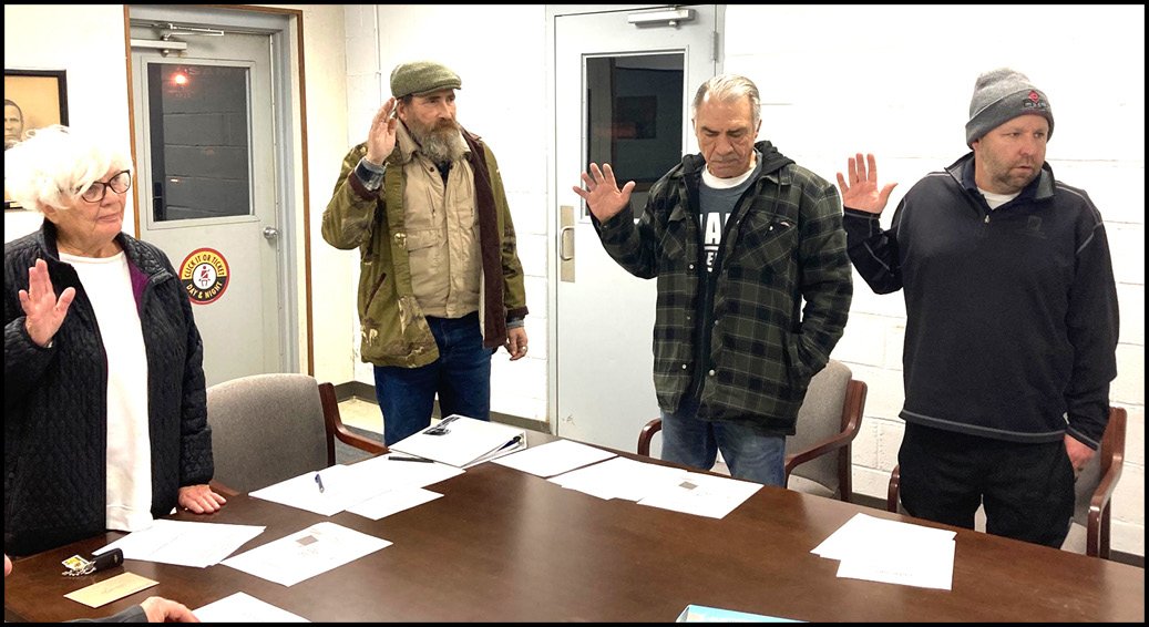 SWORN IN … From left, Blakeslee Village Council members Linda Muehlfeld, Brad Dahl, Robert Mohre and Nick Reed were officially sworn in by Mayor Eric Jenkins for another four-year term at the meeting on Wednesday, January 7.