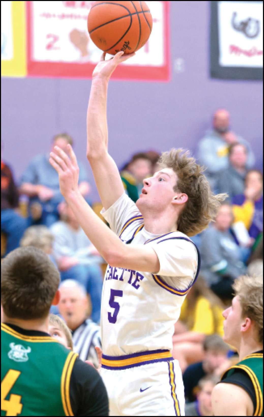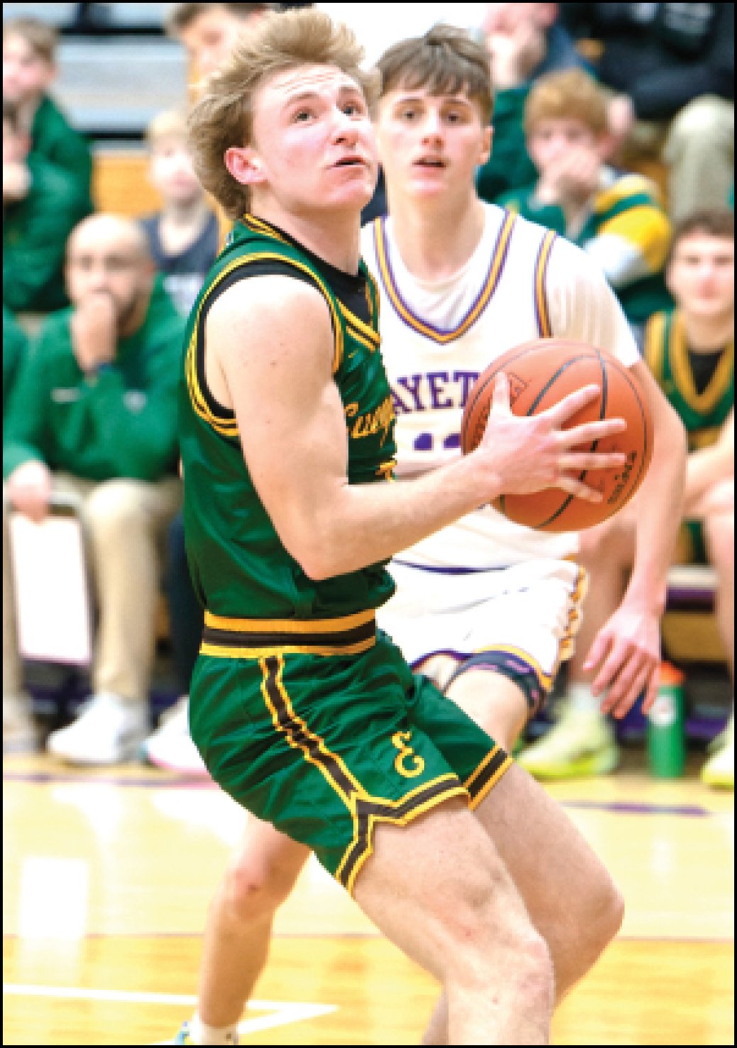George Allendorf stuck a triple in the mug of a Fayette defender, then scored off a Troy Manz steal to put Evergreen up 20-13 at the quarter.