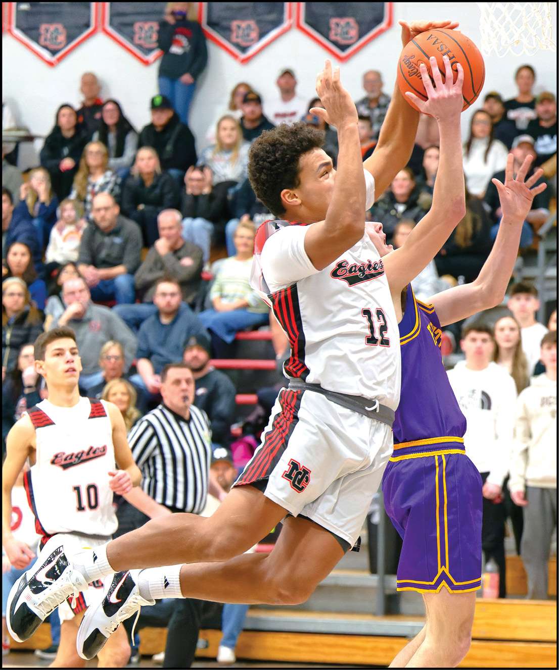 REJECTION … Zach Whitley of North Central flies in to block the shot attempt of Mason Leininger in the first quarter.