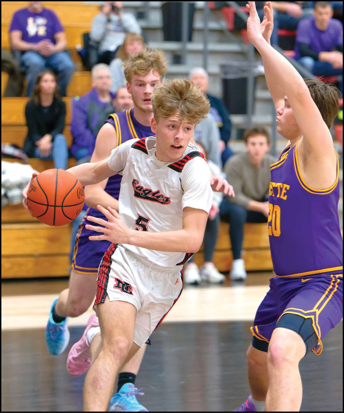 LEADING SCORER … North Central’s top scorer on the night, Jackson Poynter, drives baseline with Fayette’s Dane Andrews (right) defending.