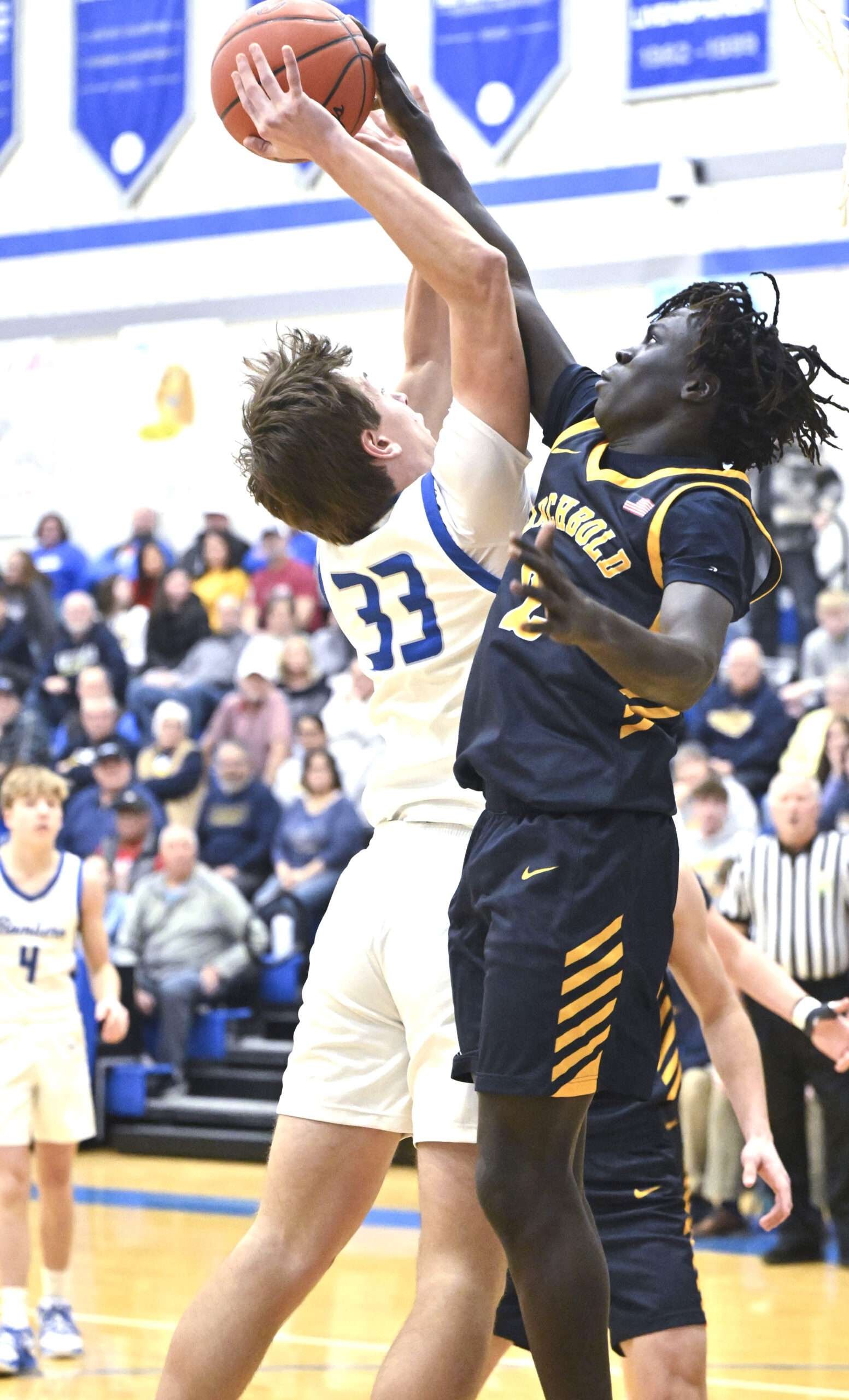 BLOCK SHOT … Archbold’s Aranjer Krieger goes up to block the shot attempt of Edon’s Briggs Gallehue.