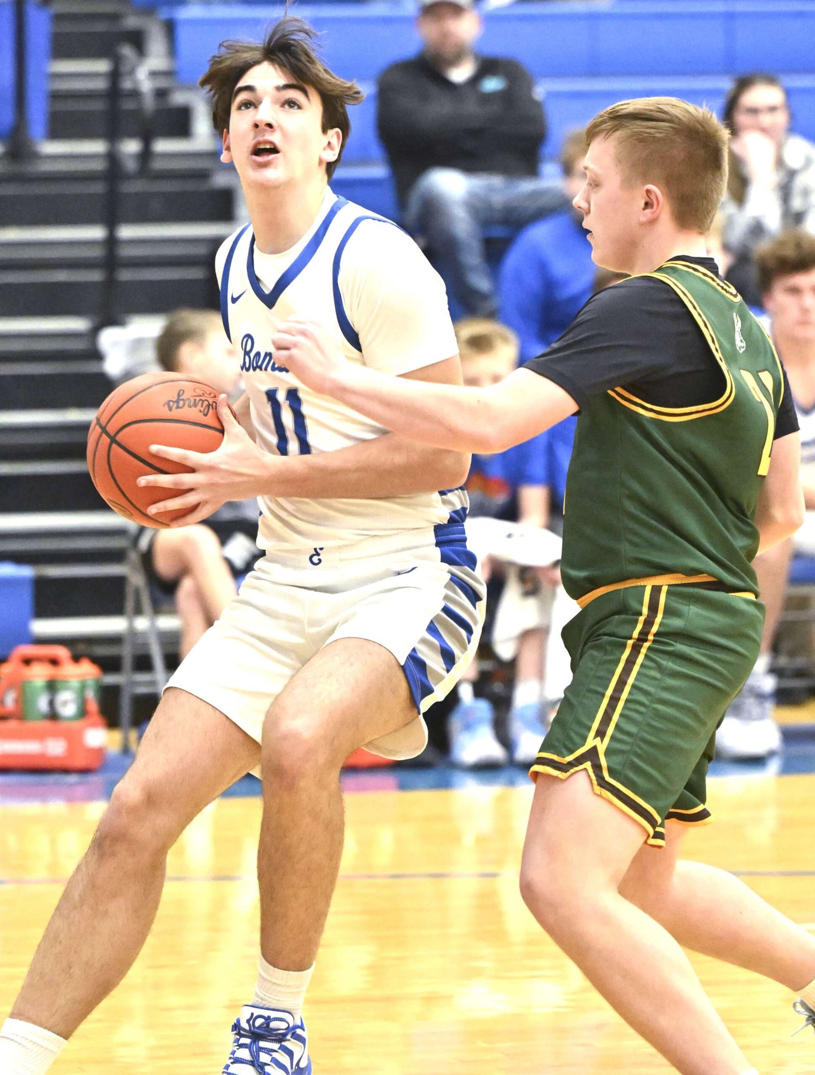 Chris Shrader nailed a pair of long-range three-pointers, with a strong drive to the rim by Ruetz in between. Bryce Bolger followed with a steal-and-score to vault Evergreen into a 29-16 lead.