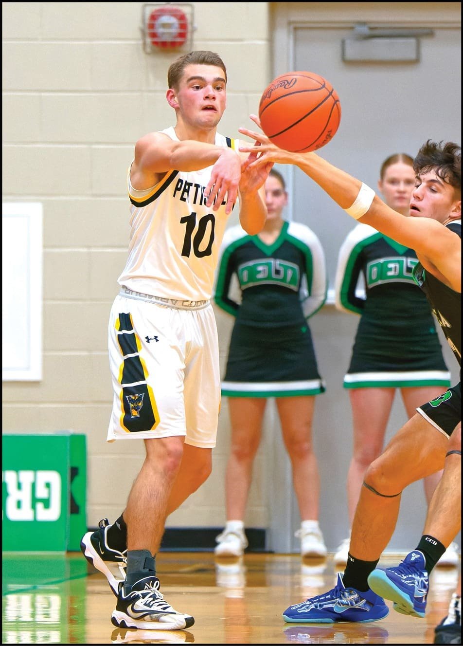 BLACKBIRD HERO … Pettisville’s Josh Morris tosses a pass in a non-league game at Pettisville High School versus Delta. Morris would later provide the game-winning triple in the final seconds of the fourth quarter. VIEW ALL PHOTOS OF THIS CONTEST FOR FREE AT WWW.THEVILLAGEREPORTER.COM