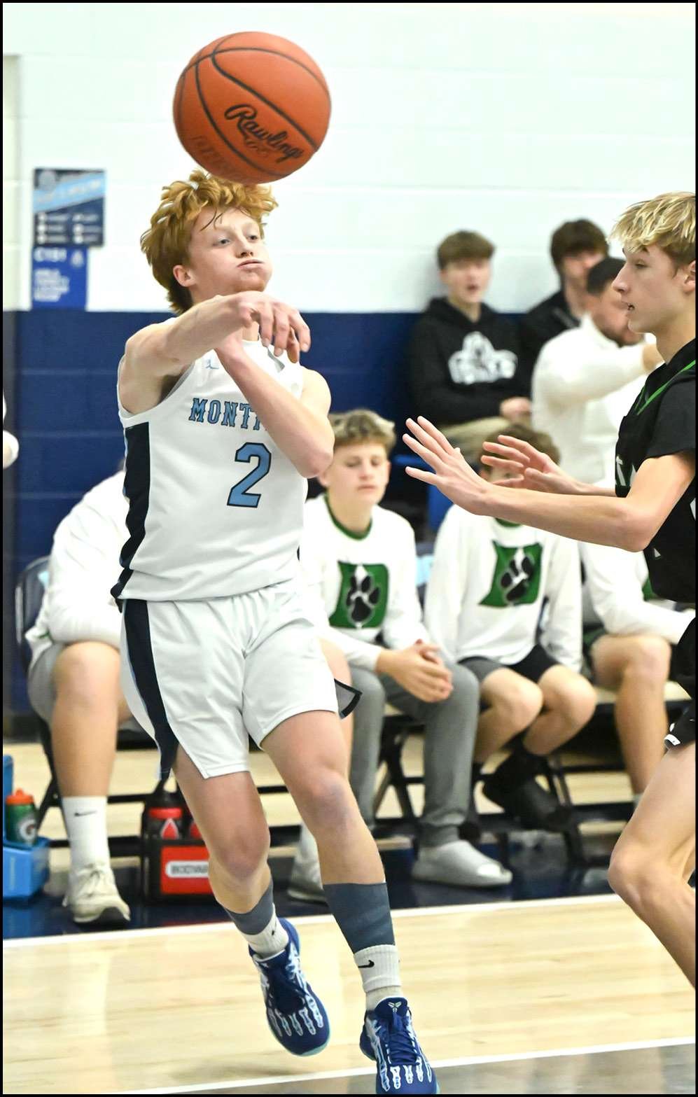SHARING THE BALL … Montpelier’s Kade Stewart throws a pass along the baseline during Saturday’s win over Delta.