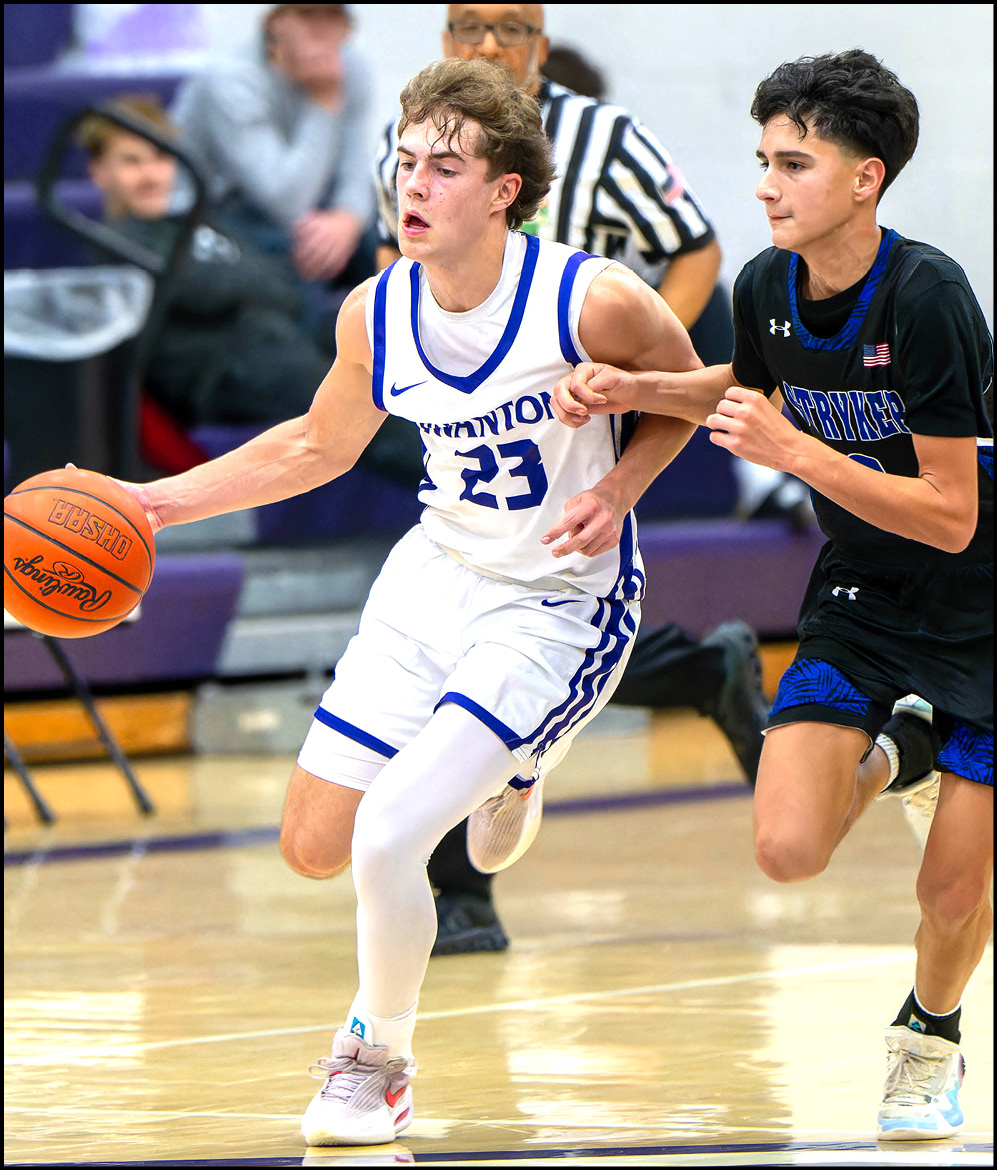NON-LEAGUE BATTLE … Swanton’s Evan Reinhard brings the ball up the floor with a Stryker defender in toe.
