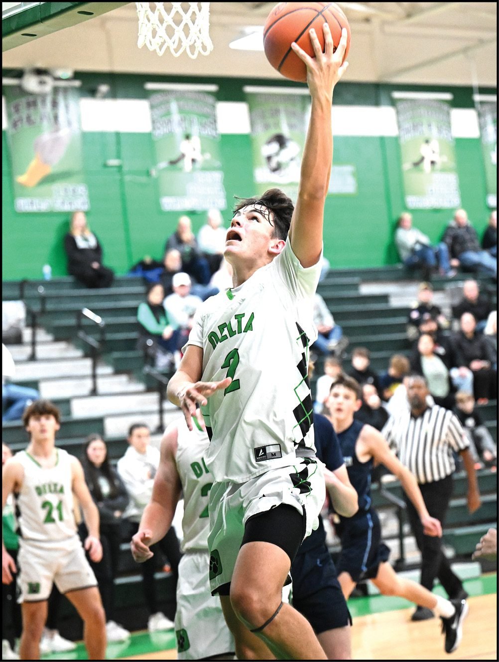 ON FIRE … Delta’s Tyson Bower drives to the hoop for a left handed layup. Bower had 34 points on the afternoon, including scoring the Panthers first 14 points of the third quarter in a 62-43 win. VIEW 141 PHOTOS OF THIS CONTEST FOR FREE AT WWW.THEVILLAGEREPORTER.COM