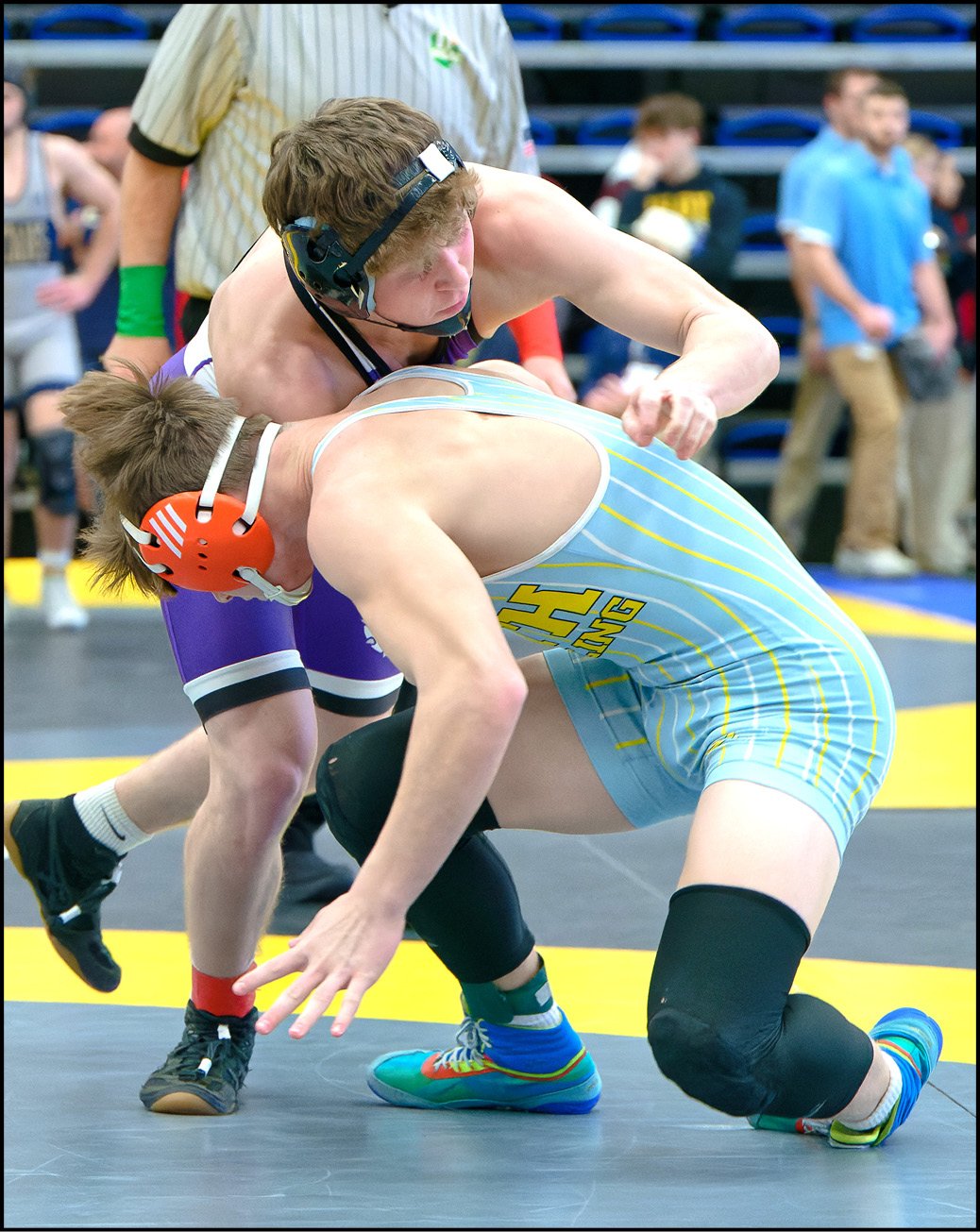 157 POUNDS … Swanton’s Chase Godwin (purple) makes a move on Bentley Webb of Lima Bath. Godwin beat Webb by major decision (14-2) in the consolation rounds and would finish fifth at 157.