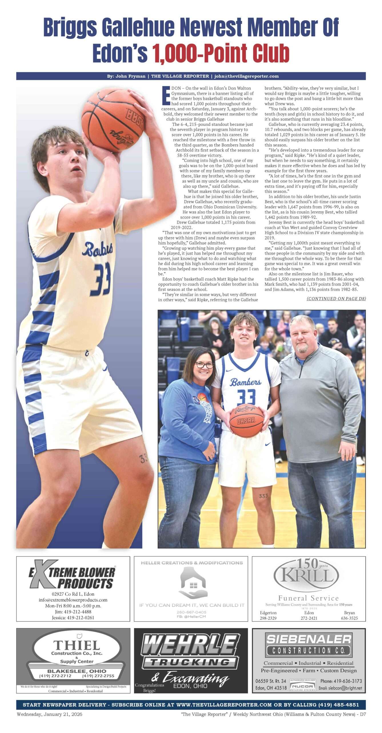 EDON – On the wall in Edon’s Don Walton Gymnasium, there is a banner listing all of the former boys basketball standouts who had scored 1,000 points throughout their careers, and on Saturday, January 3, against Archbold, they welcomed its newest member to the club in senior Briggs Gallehue