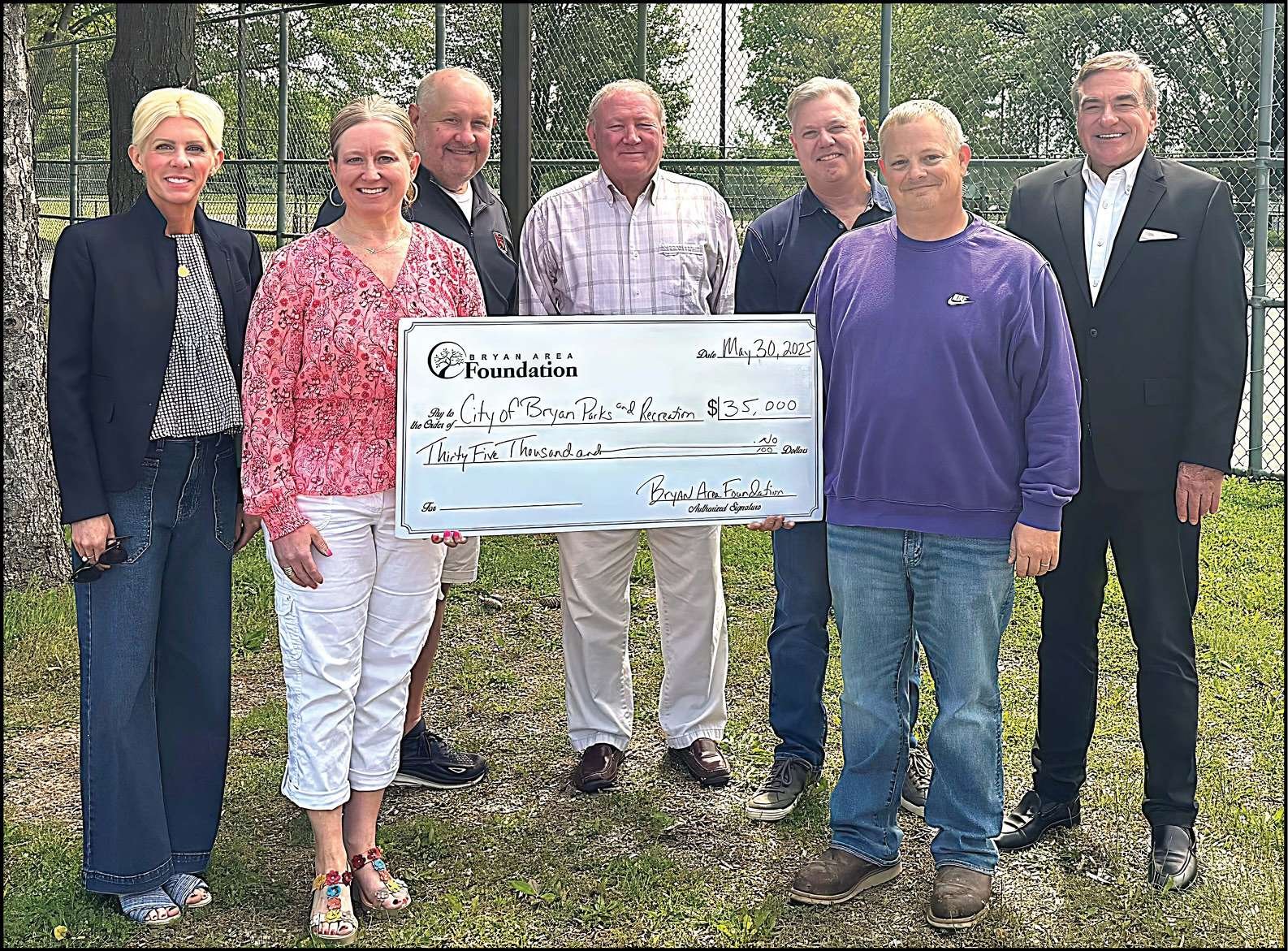 EXERCISE PATH … The Bryan Area Foundation awarded a $35,000 grant to the City of Bryan Parks and Recreation Department to help pay for a pedestrian pathway in East End Park. To be completed by early fall, the new .3-mile loop in and around East End Park will provide Bryan residents another walking, jogging, and biking pathway for leisure and exercise. It will be eight feet wide and made of concrete, allowing non-motorized pedestrians the ability to use the pathway, weather permitting, all year round. Pictured left to right during the check presentation are Bryan Area Foundation President/CEO Amy Miller, Bryan Area Foundation Grant Making Committee member Carolyn Sharrock-Dorsten, Bryan Area Foundation Grant Making Committee chair Mark Miller, Bryan Area Foundation Grant Making Committee members Mike Johnson and Steve Voigt, City of Bryan Parks and Recreation Department Director Ben Dominique, and Bryan Area Foundation Grant Making Committee member Cliff Oberlin.