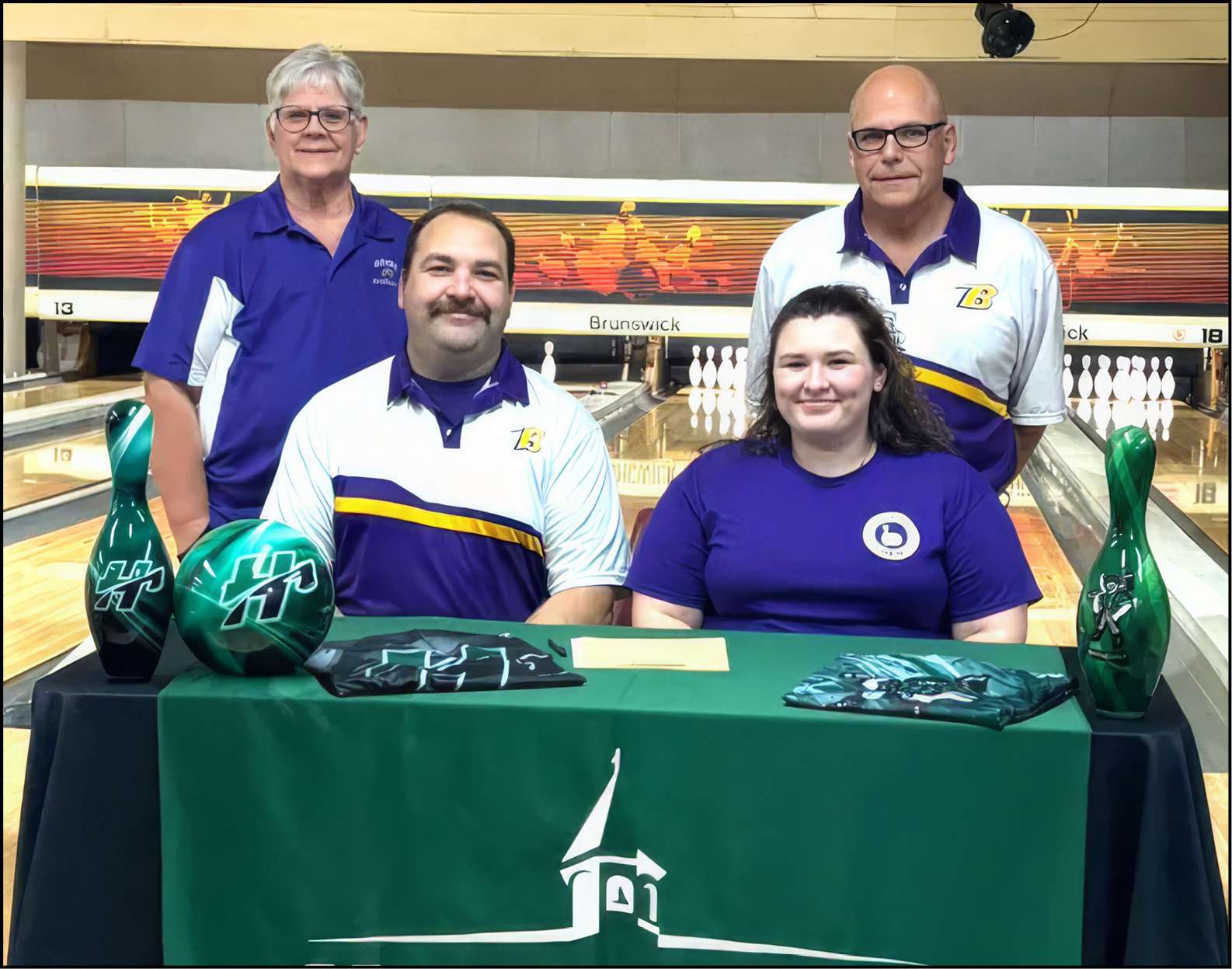 LETTER OF INTENT … Bryan High School senior bowler Polly Sleesman recently signed a letter of intent to continue her bowling career at Huntington University in Huntington, Indiana. Front row from left: Brittany Sleesman (mother), Polly Sleesman, and Clayton Sleesman (father). Back row is Huntington University women’s bowling coach Mike Shockey.