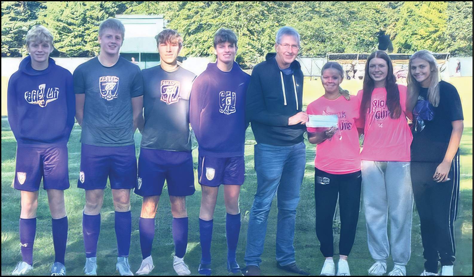 GAME FOR CHARITY … On August 26th, the Bryan boys and girls soccer teams played their “Kick for the Cure” soccer games. The teams raised $1,025 through 50/50 tickets and a bake sale. All proceeds were donated to Cancer Assistance of Williams County to support local families in need. Pictured are left to right, Connor Thiel, Carter Thiel, Nolan Sleesman, and Tucker Miller of the Bryan High School boys soccer team, Rick Hanson, Cancer Assistance of Williams County Board Member, and Ava Zimmerman, Josey Arnold, and Mylie Vollmer of the Bryan High School girls soccer team.