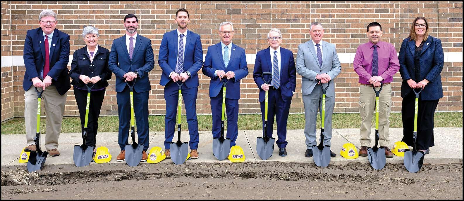 BREAKING GROUND … A groundbreaking ceremony was held in the Bryan High School Gymnasium to celebrate the new Bryan Career Tech building and Athletic Facility. Following the ceremony, a short actual groundbreaking took place outside. Pictured are: Rep. James Hoops (R-Napoleon, 81st House District), Bryan School Board member Debra Opdycke, Bryan School Board President Caleb Turnbull, Bryan Superintendent Mark Rairigh, Lt. Gov. Jim Tressel, Gov. Mike DeWine, Bryan School Board members Lynn Wieland and Ben Camarillo, and Bryan Mayor Carrie Schlade.