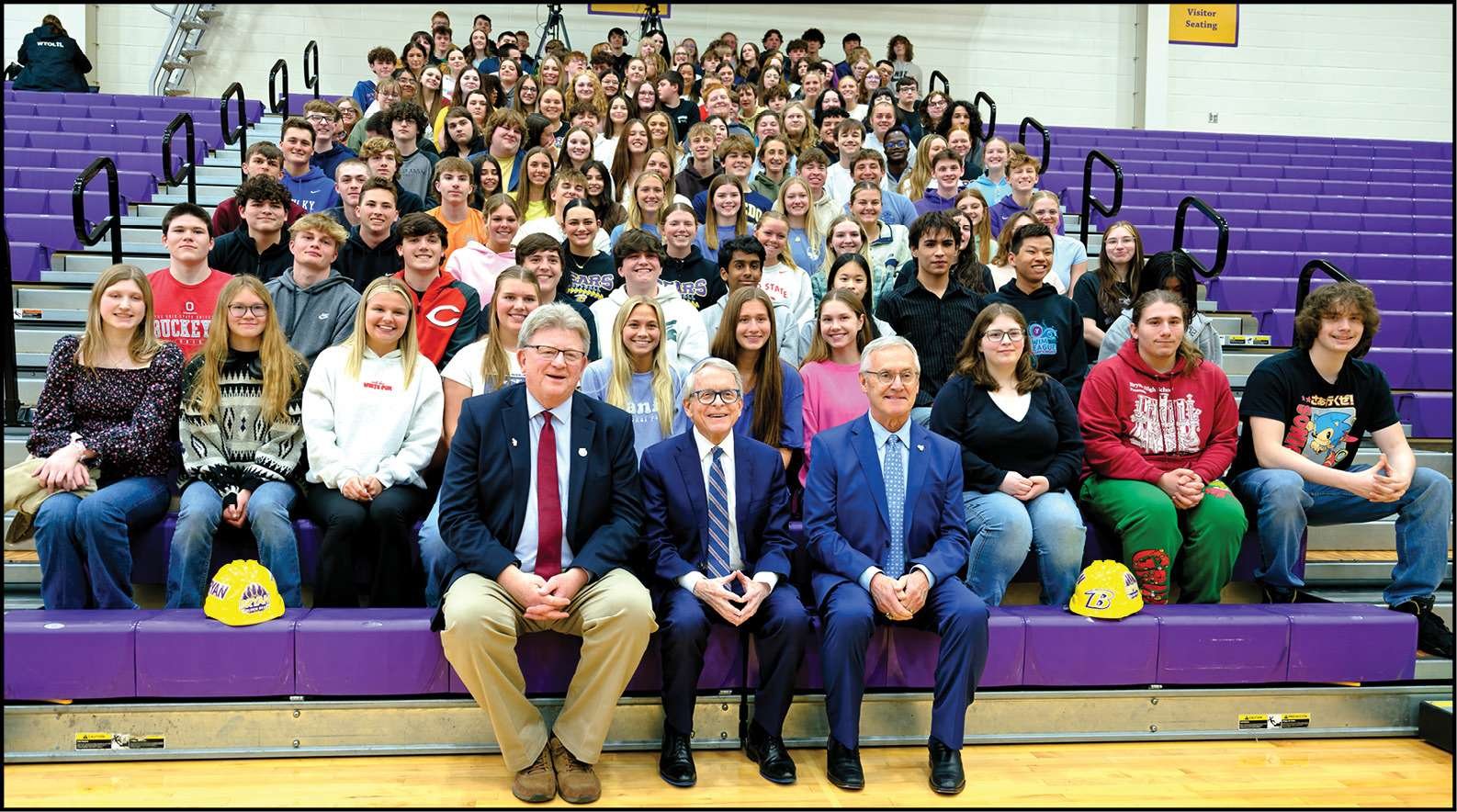 GROUP … Ohio House Representative Jim Hoops, Ohio Governor Mike DeWine, and Ohio Lt. Governor Jim Tressel sit with a group of Bryan students who were present for the groundbreaking ceremony.